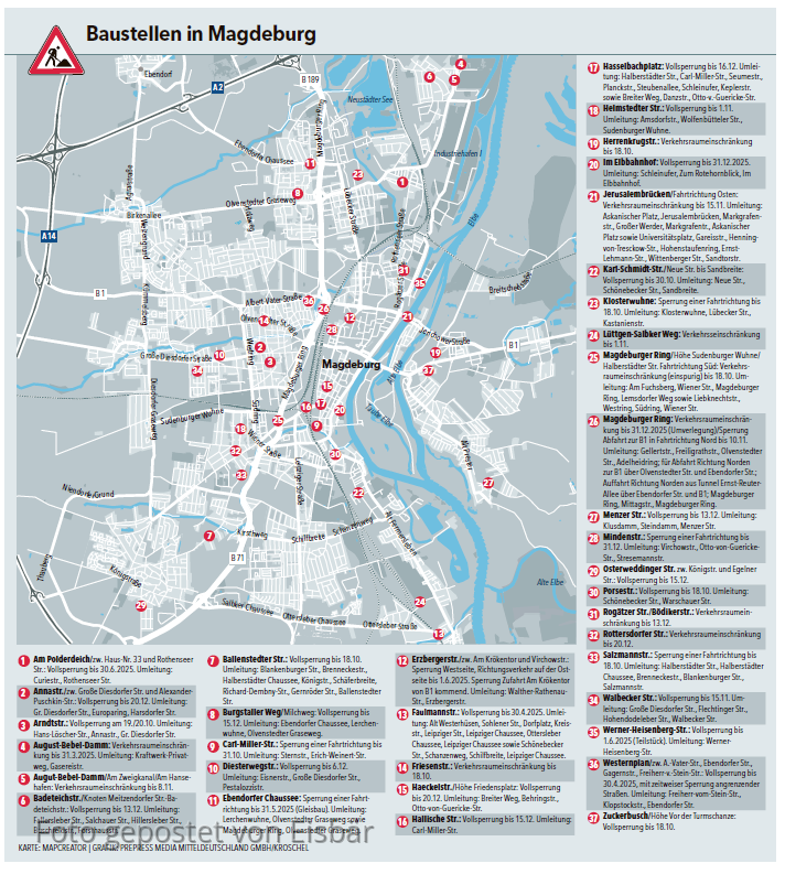 Ausserdem hat Magdeburg z.Z. 37 Baustellen. Welche davon im november noch sind kann ich nicht sagen. Ohne Google Maps ist es unmöglich klarzukommen. Zur Zeit ist an einer Kreuzung kurz vor der Messe eine Baustelle. Ich stelle mal ne Übersicht rein. Die 21 wird für euch ne Rolle spielen.