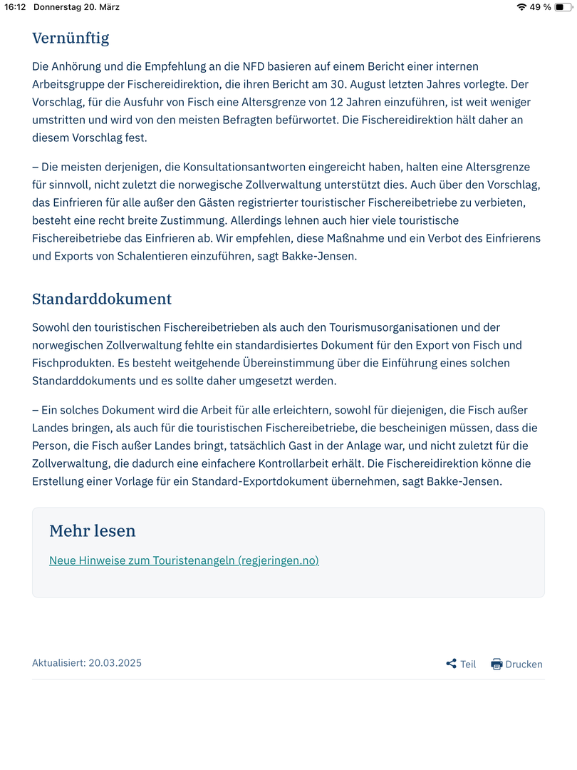 Wow, da hat sich eine Arbeitsgruppe des Fiskeridirektoratet durch 260 eingegangene Anhörungs-Stellungnahmen gewühlt um dann doch bei ihren eingangs vorgeschlagenen Empfehlungen zu bleiben und diese dem Ministerium für Handel, Industrie und Fischerei so auch übermittelte. Diese prüft nun Ministerin Sivertsen Næss gründlich, bevor sie in dieser Angelegenheit Stellung nimmt und entscheidet. Einzig der Vorschlag zur zeitlichen Umsetzung blieb offen.