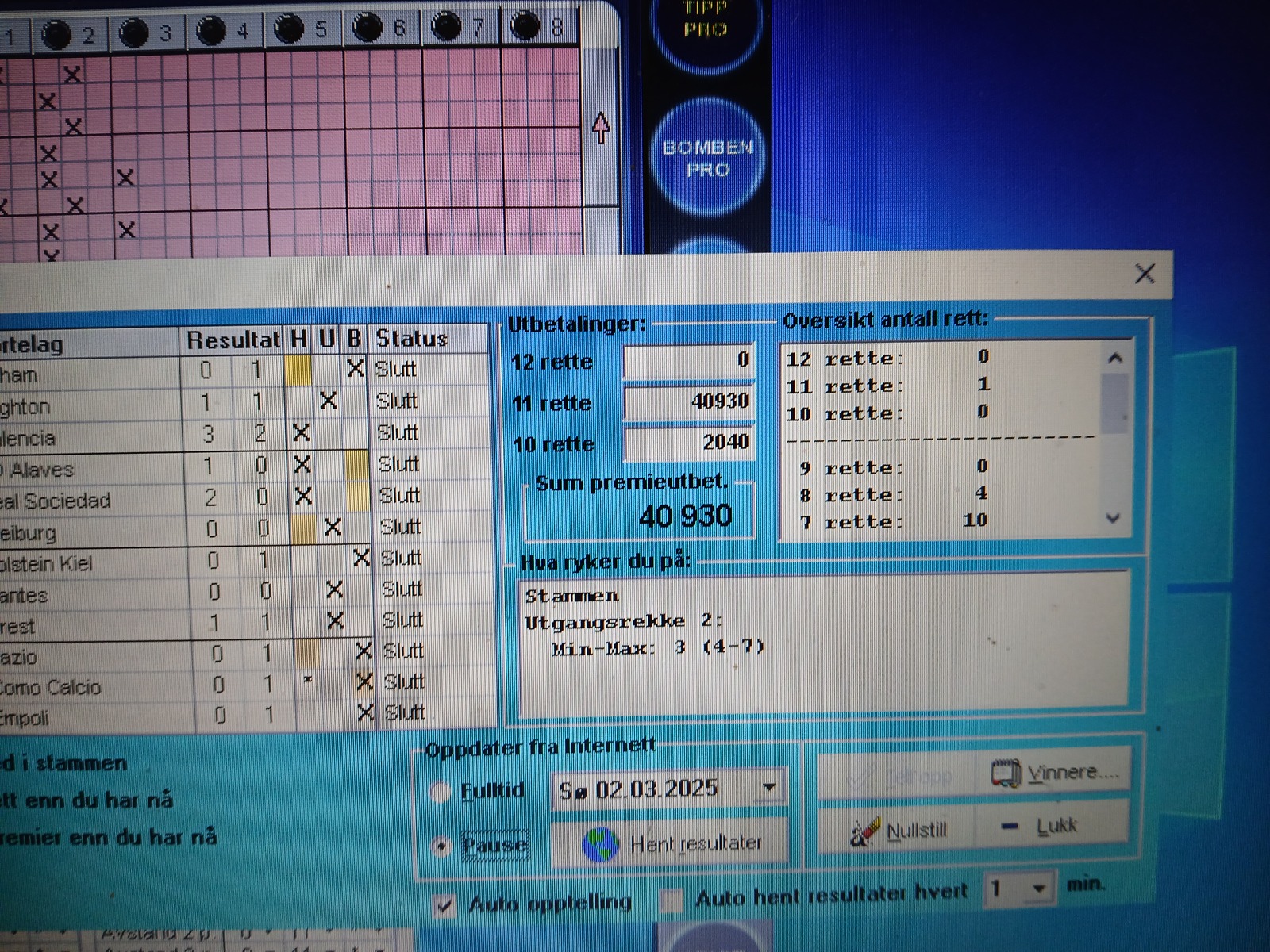 Die Fehl-Einschätzung eines italienischen Clubs kostete mich den Hauptgewinn im Pausenergebnis (den diesmal niemand erreichte) aber ich bekam zumindest einen netten Trostpreis von fast 41.000 NOK für elf Richtige, zweiter Rang. Sonntagskind halt ... fängt gut an das Jahr ^^ ... meine bessere Hälfte meinte nur ganz trocken: du brauchst ja wohl langsam ein neues Tippkonto, das alte muss doch langsam mal voll sein ...