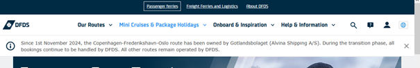 Es geht zumindest im Internet auf deren Homepage, sofern man einen Account hat. Und diese Meldung kam dann nach dem Ausloggen - der Text hinter dem großen I sagt. dass DFDS weiter Bookings durchführt.