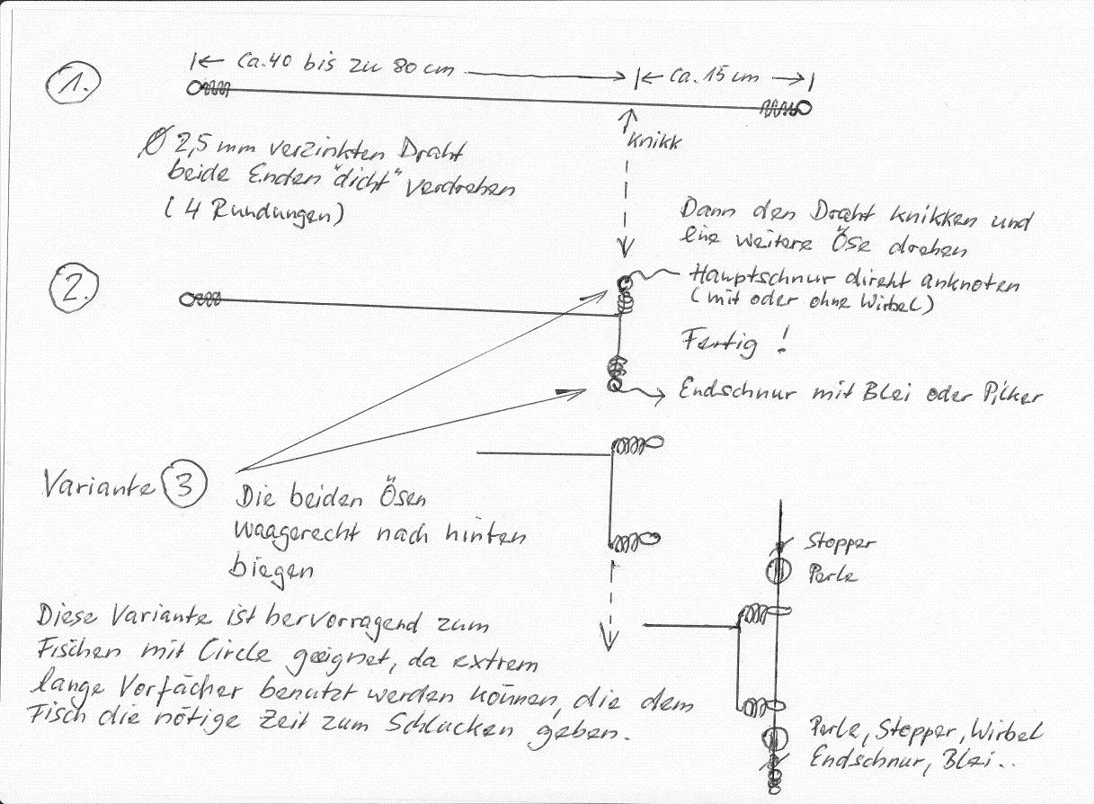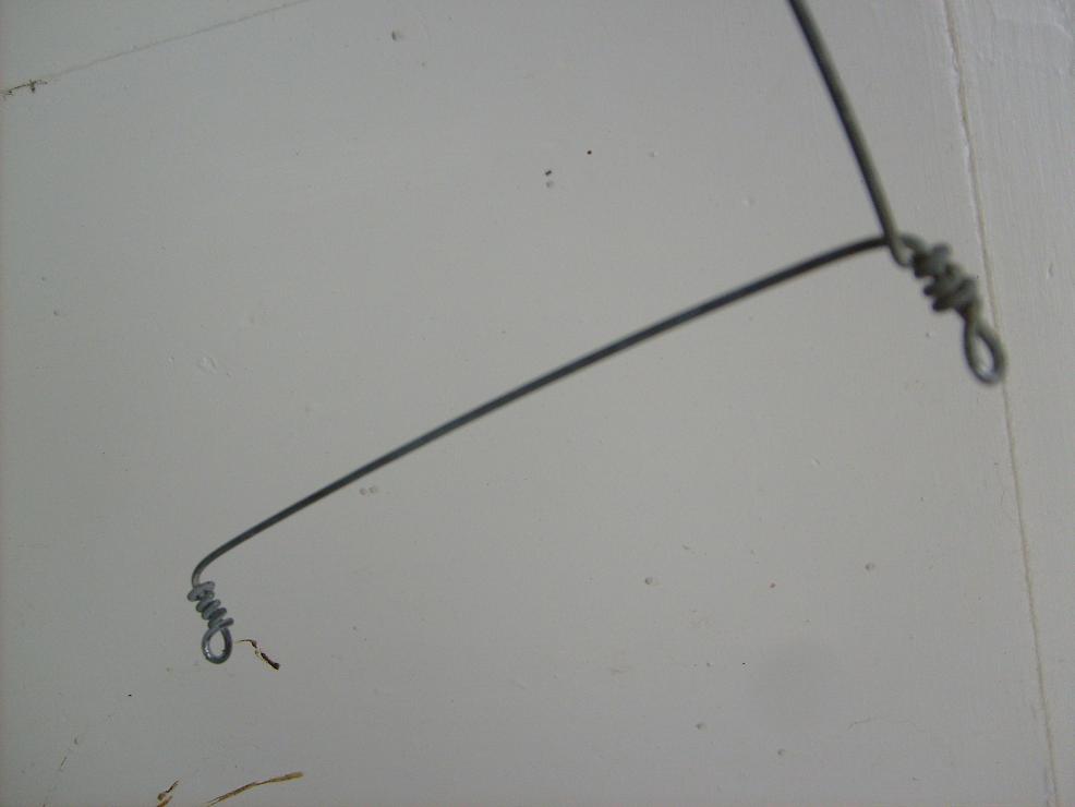 Der dickste grüne Blumendraht ging einigermaßen. Sah auch ganz hübsch aus. Allerdings musste ich den nach jedem besseren Hänger/Fisch wieder per Hand in Form bringen. -