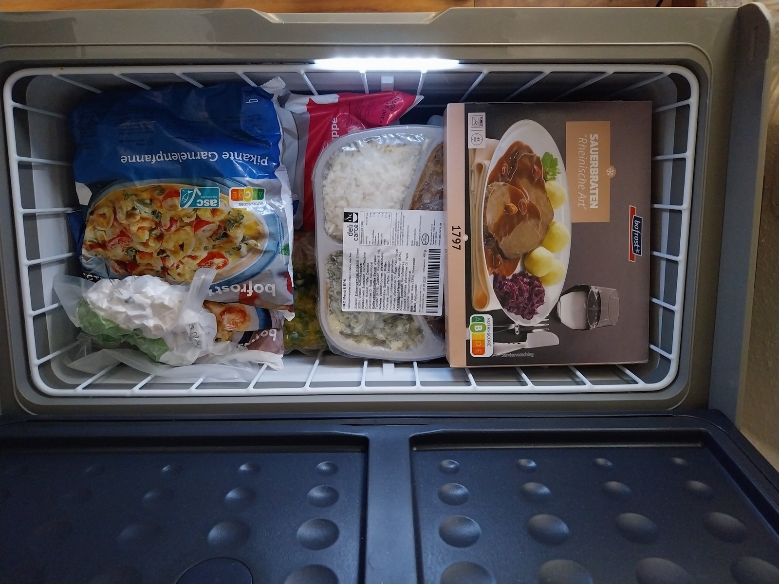 Wir nutzen die 50 Liter Zone für unseren Fisch. Wenn wir die Filets Abends in den Kühler legen, sind sie am Morgen steinhart. Der Vortei liegt auf der Hand. Am Ende unserer Reise bleibt das ein Block Fischfilet. Wir gehen immer so gegen 13.00 Uhr in Oslo auf die Fähre. Die Zone hat dann ca. - 18°C. Am anderen Tag in Kiel sind es dann gegen 10.00 Uhr immer noch um die - 8°C.
