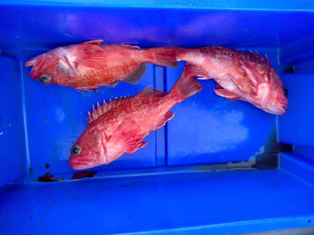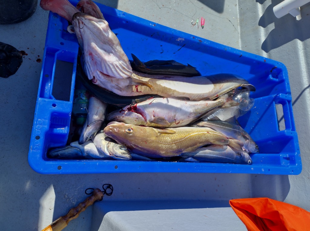 Immer wieder sind wir an verschiedenen Stellen mit dem Naturköder-Geschirr aktiv gewesen, es kam mal hier ein Pollack, dort ein Dorsch oder Schellfisch heraus. Der eine oder andere Leng war immer dabei. Dann hatten wir auch 2 Katzenhaie von etwa 60cm und 4 Samtbauchhaie (kleiner schwarzer Dornhai) von knapp 40cm. Der Eine hat mich auch gestochen, ist aber nicht richtig durch die Hornhaut gekommen, somit kein Problem.