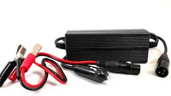 Einfach dieses Ladegerät an eine mit 10/15 A abgesicherte 12 V Steckdose anschliessen, die Krokodilklemmen an + und - befestigen, fertig. Ladestrom 7 A. Die Box selber würde ich an einer 2. Steckdose versorgen. So lädt der Akku schneller.