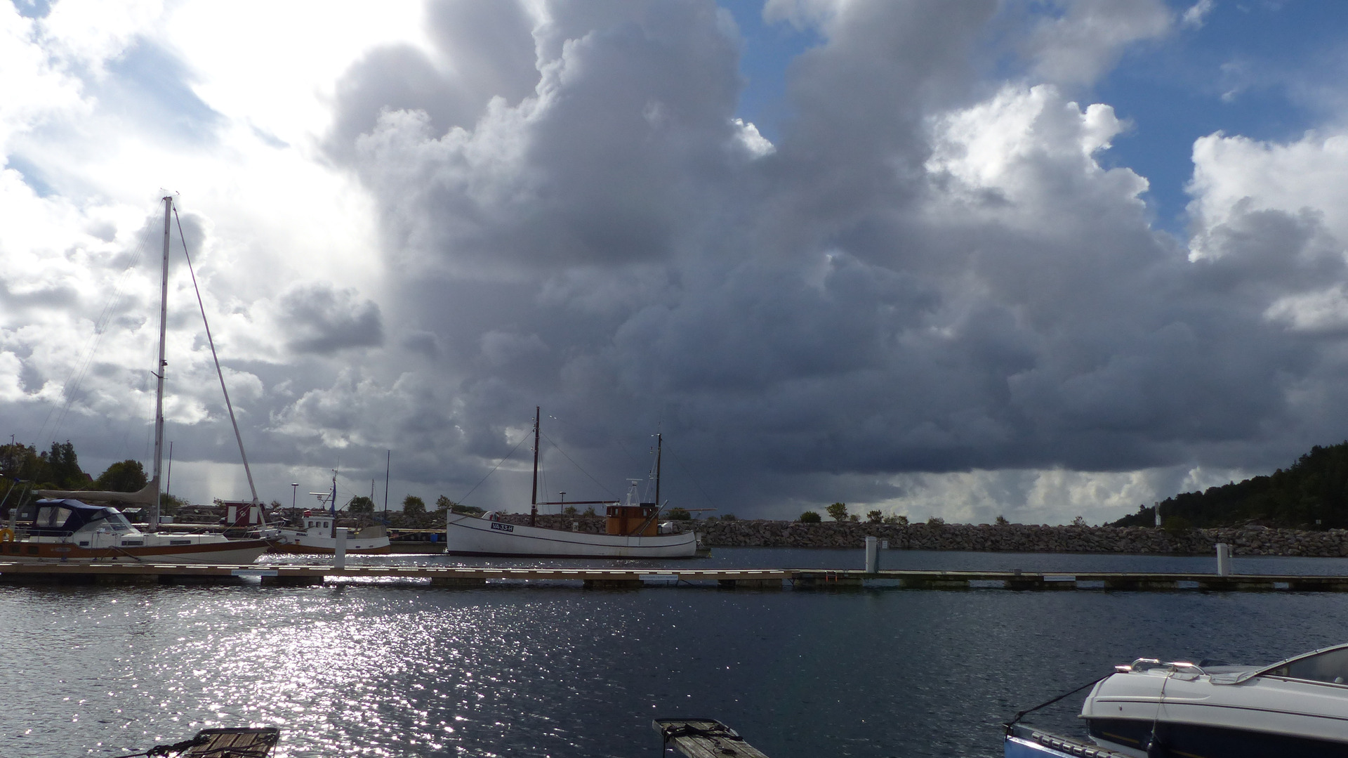 Hallo liebe Angelfreunde, heute morgen war der graue Himmel verschwunden. Ab und zu schaute etwas schüchtern die Sonne raus. Aber das waren nur kurze Momente. Es sollte ja auch regnen. Nach dem Frühstück gingen wir auf Jagd nach den Schuppenträgern. Im Boot hatte ich diesmal meinen selbstgebauten Rutenhalter mit den Saugnäpfen angebracht, da wir keine Reling am Boot hatten. Die Saugnäpfe hielten bis jetzt prima. Zuerst hatte ich einen 12cm langen blau-grauen Gummifisch aufgezogen. Beim 2. Wurf gab es einen Schlag und die Spitze der Rute ging ins Wasser. Ich hatte ganz schön zu tun, umimmer gut gegen zuhalten. Als der Fisch zu sehen war, stand fest, ein Pollack von schöner Größe. Als ich ihn an Bord hatte, staunte ich, der Gummiköder war nicht zu sehen. Der Pollack hatte ihn völlig einverleibt. Durch das Maul bekam ich ihn nicht raus, so tief steckte er in dem Fisch. Das war ein guter Anfang. Kurz darauf kam der erste Schauer. Im weiteren Verlauf wollte kein Fisch mehr mit uns mitfahren. Langsam regnete es sich ein und wir beschlossen abzubrechen. Im Bootshaus angekommen schüttete es wie aus Kannen. Zur Zeit ist es wieder wolkig mit kleinen blauen Ausschnitten. Wir werden sehen, wie es morgen ist. Bis dahin sagen tschüß Ilona und Heinz