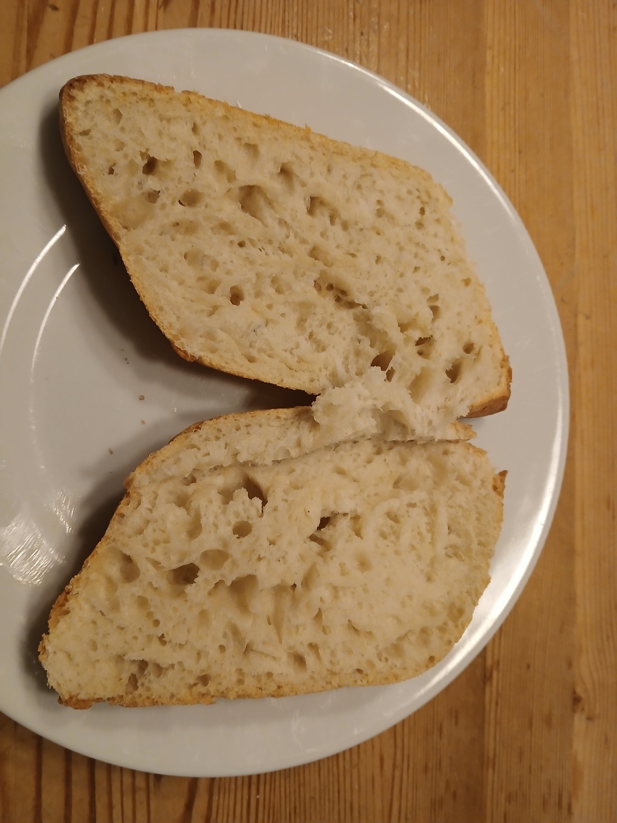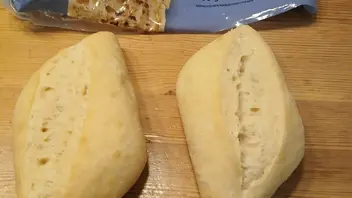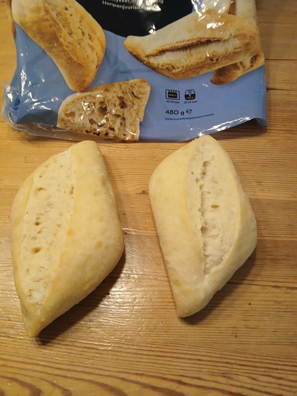 Wenn man sie aufschneidet, sieht man gleich die schöne Sauerteig-Textur. Sauerteig soll laut meinem Medizinmann besonders für alternde Mägen gesünder sein, als normaler Brötchenteig.h werde mal Kontakt aufnehmen zu der Firma und denen erklären, das es in Norwegen 30.000 Deutsche gibt, von denen bisher leider nur die wenigsten diese Brötchen kennen.