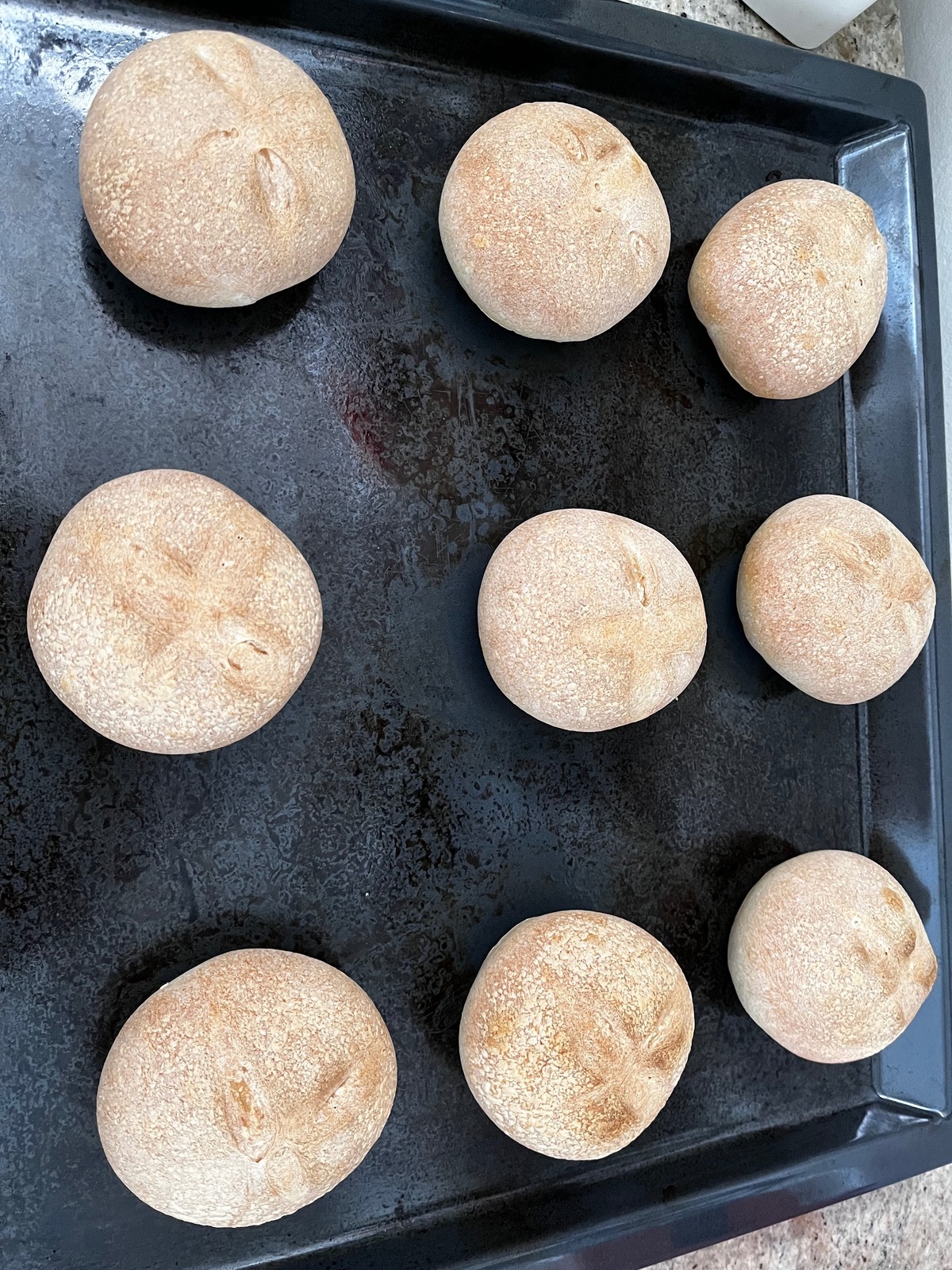 Eine Stunde bei Zimmertemperatur angehen lassen, über Nacht abgedeckt in den Kühlschrank, ca. 9 Stück Brötchen formen, eine Stunde gehen lassen.