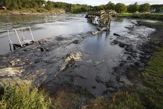 NRK hat einen Film ins Netz gestellt, der zeigt, wie Freiwillige dabei sind, den Ölteppich an der Küste abzusaugen.