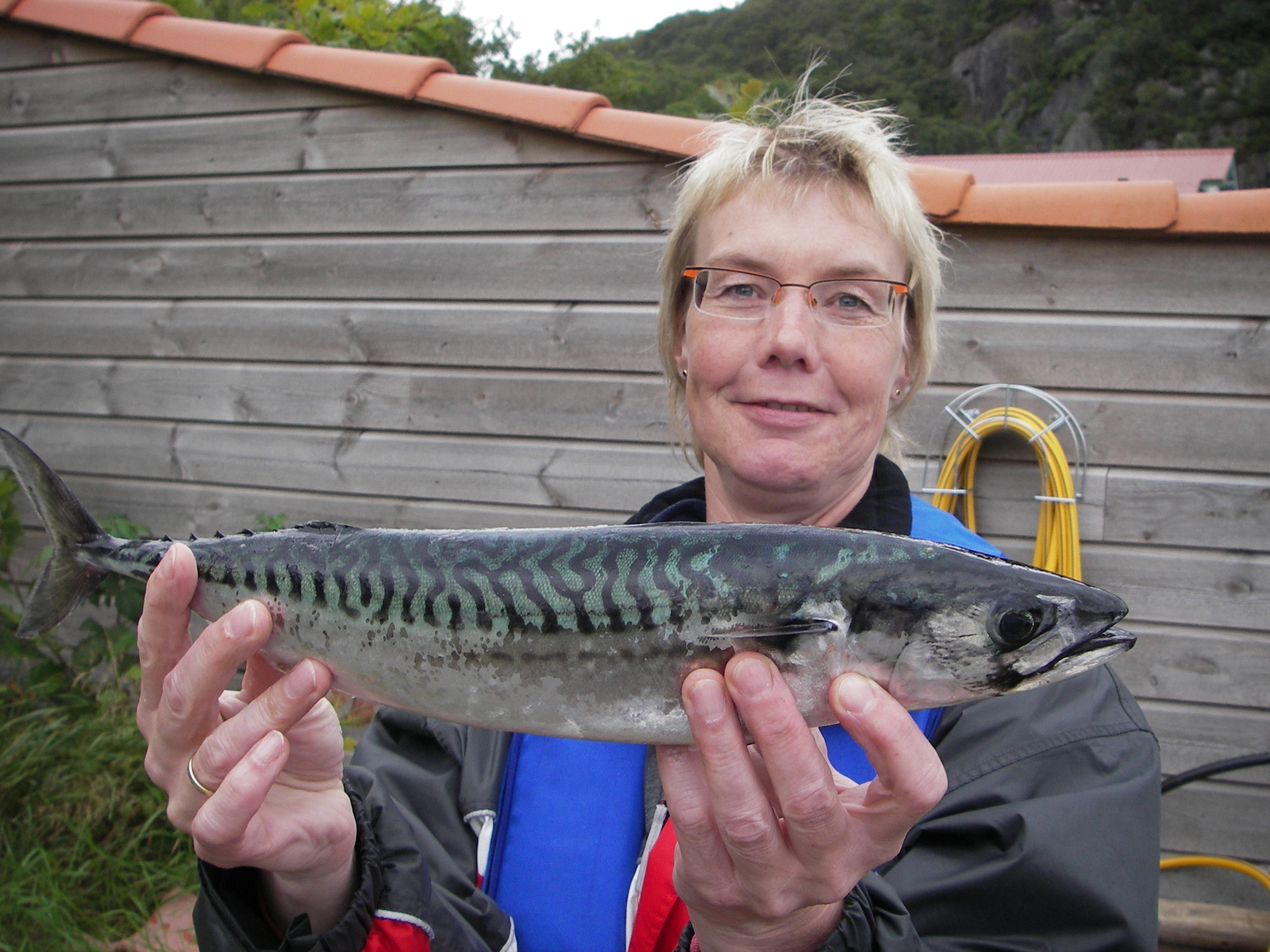 Morgens nach heftigem Gewitter präsentierte der Innenfjord spiegelglattes Wasser. Glücklicherweise wurde ich um 6.ooh wach. Also dann, rein die Angelklamotten und rauf aufs Wasser. Mein Freund und sein Sohn waren sofort hellwach. Komisch, eigentlich Langschläfer :gute-nacht:. Wir Männer sind halt Jäger … Ab Richtung Rasvag und rechts durch die Schären aufs Meer. Aber die Wellen draußen waren doch zu heftig, also im geschützten Bereich bleiben. Junior fing den ersten Fisch. Makrele !