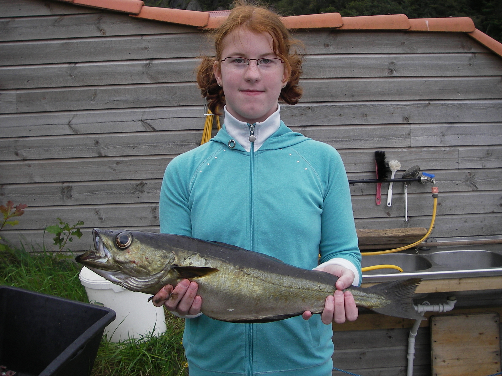 Es dauerte keine 5 Minuten, als die mit Makrelenfetzen besetzte Rute meiner Tochter ausschlug. Ich glaubte, sie hat sich mehr erschrocken als der 58er Pollack, der ans Tageslicht kam :baby:.
