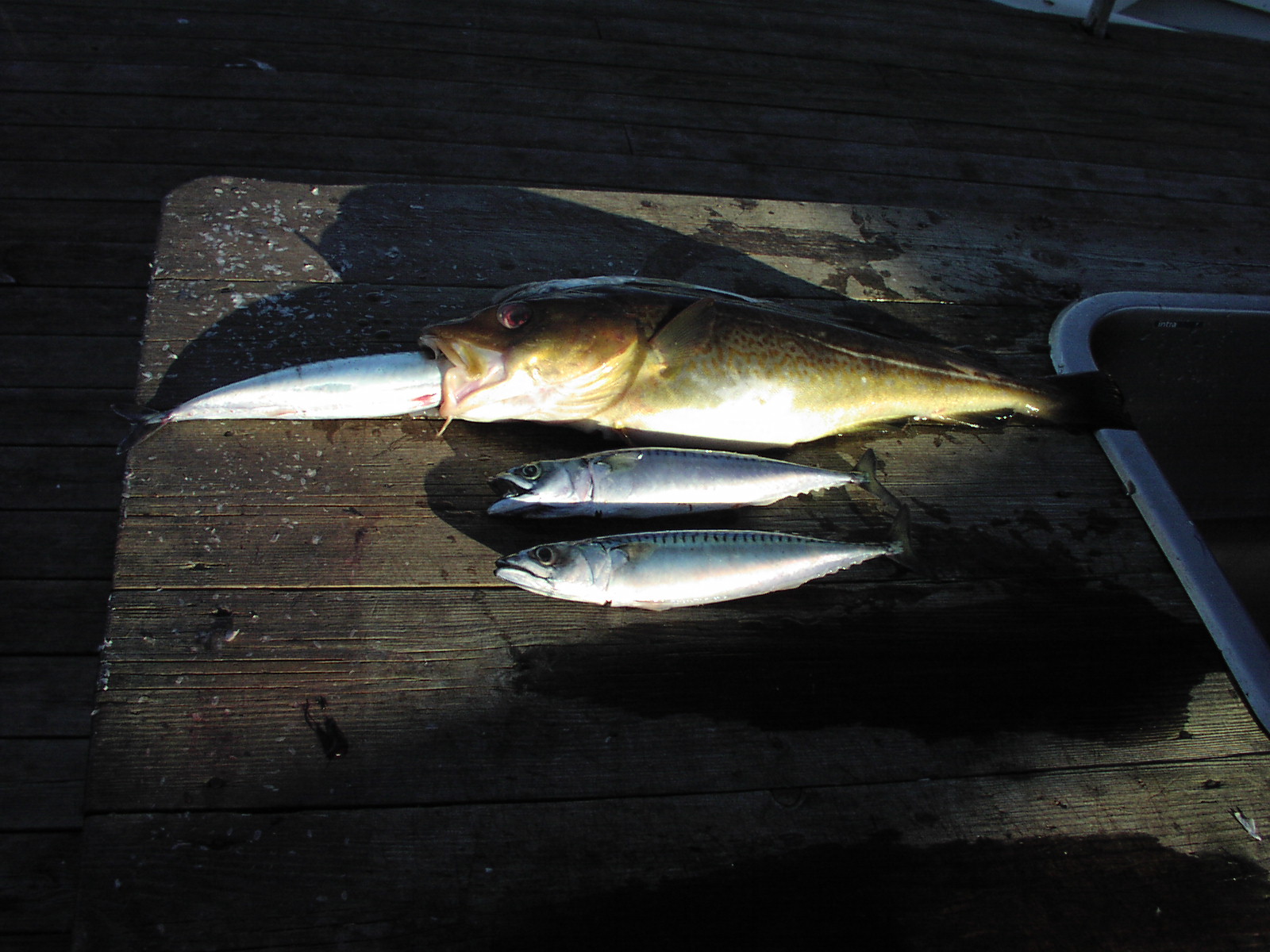 Am Donnerstag ging es raus, der Wind hatte endlich gedreht und die Shrimps waren weg. Fisch mußte einfach Hunger haben auf unseren bunten Kram. Heute gab es Köhler bei 50 Meter. 90 Minuten später hieß es Abbruch :baby::baby: wir hatten schließlich 120 Fische im Behälter (Bild 3). Das war für mich das erste Mal das ich beim Angeln klatschnaßgeschwitzt war.