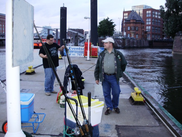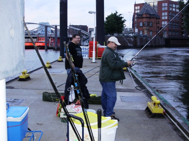 Also atok zu den Landungsbrücken an meine Hausstelle, was soll ich sagen, auch besetzt:eek: Martin mußte mich nach diesen Erfolgserlebnissen doch ziemlich überreden unser Glück an der Überseebrücke zu probieren, gesagt, getan, in den ersten anderhalb Stunden konnte ich 4-5 Aale über der Magischen 50cm Grenze mein eigen nehnen, bis die Flut richtig einsetzte,dann hielt auch 150gr den Haken nicht mehr an ort und Stelle. Da es mittlerweile schon so cirka 1 Uhr morgens war war an einen Angelabbruch garnicht zu denken,also Angelgeröddel wieder eingepackt und zum Kehrwiederspitzenanleger umgezogen:D