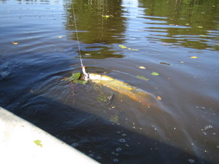 Natürlich wieder Marco (Glück ist mit dem Fleißigen)! Die Hechte im oberen Bereich des Flusses standen sehr nah an der Seerosenkante, so dass man öfters mal einen Hänger im Schilf oder an den Seerosen hatte. Also Ruder wieder in die Hand und hin zum Hänger.