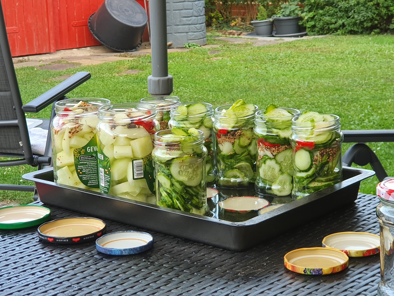 Ca. 40 Gläser Senfgurken, Cornichons und dänische Gurkenscheiben, 10kg Wachsbohnen und fast täglich viele Rispentomaten.