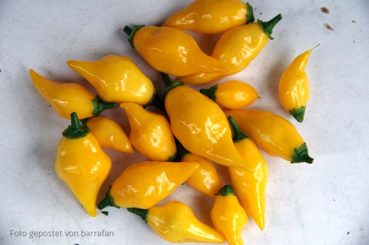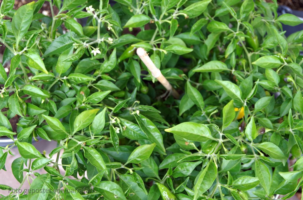 Die 6 Pflanzen der Aji Mojero haben alle noch Blüten, die ich dann fast täglich versorge. Es schimmert auch schon gelb durch.
