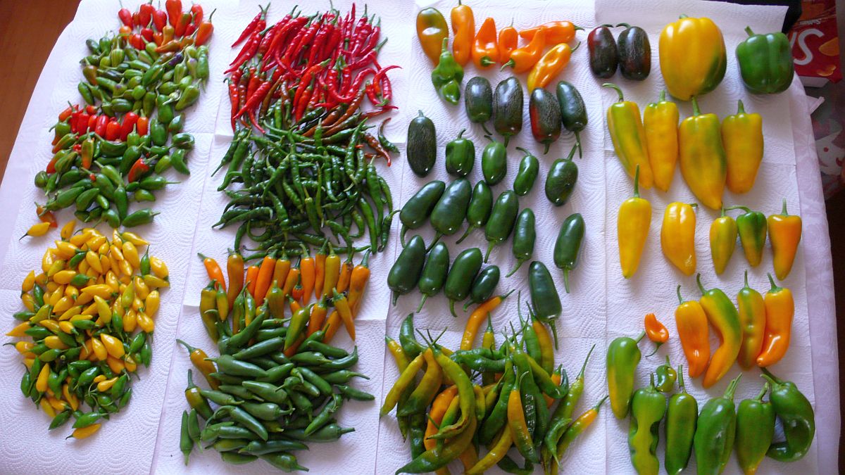 Links oben die Golden Marconi, dann die noch grünen Jalapeno Concho und Schoten der Guyana PI.