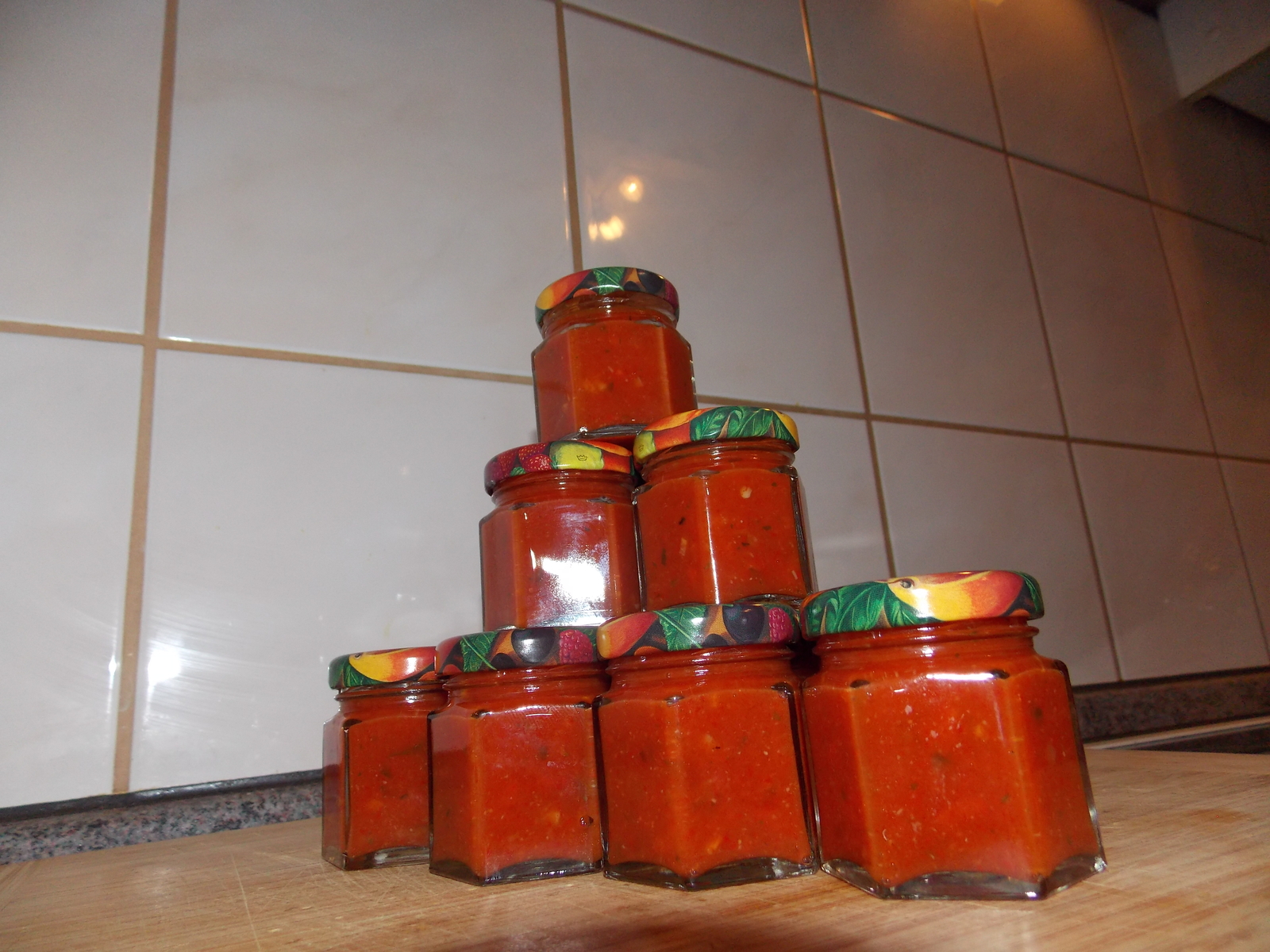 Die schon "sehr schlonzige" und heiße Sauce in vorher heiß ausgespülte Schraubgläser geben - fertig.