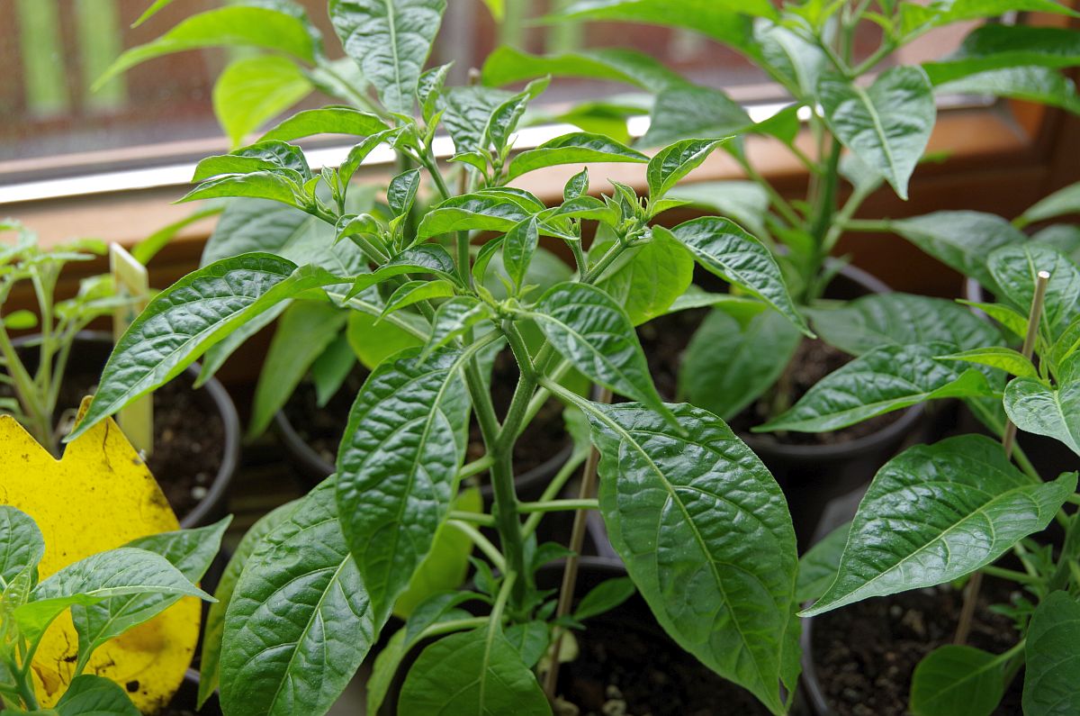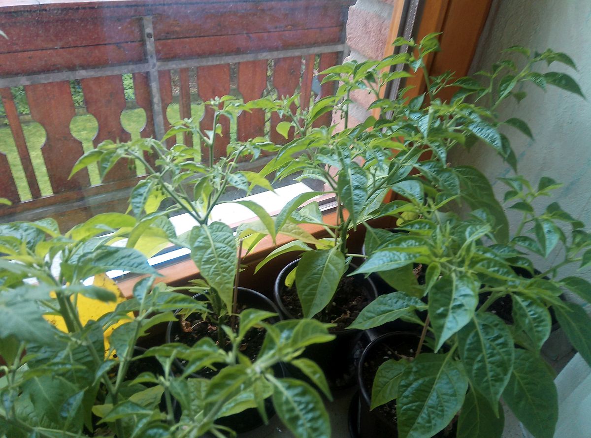 Die 6 Pflanzen der Aji Mojero haben alle noch Blüten, die ich dann fast täglich versorge. Es schimmert auch schon gelb durch.