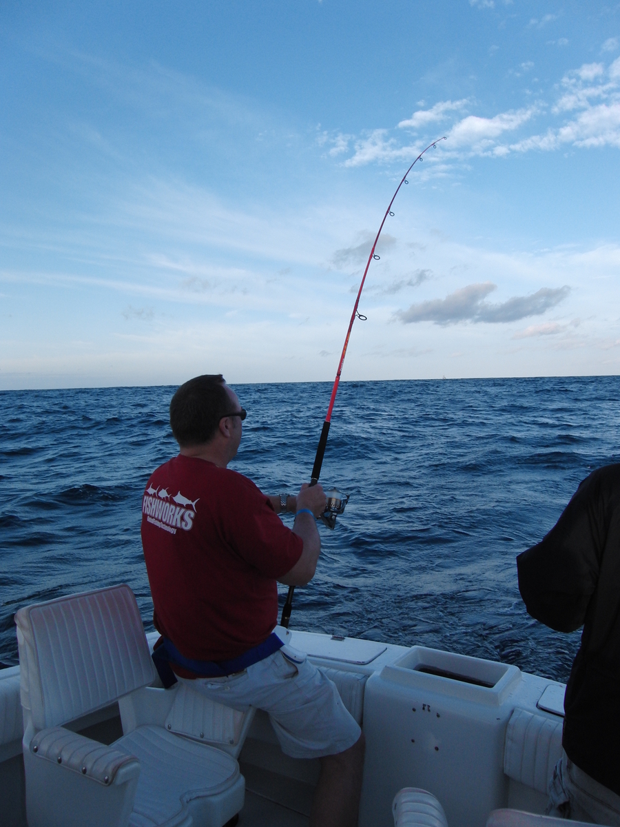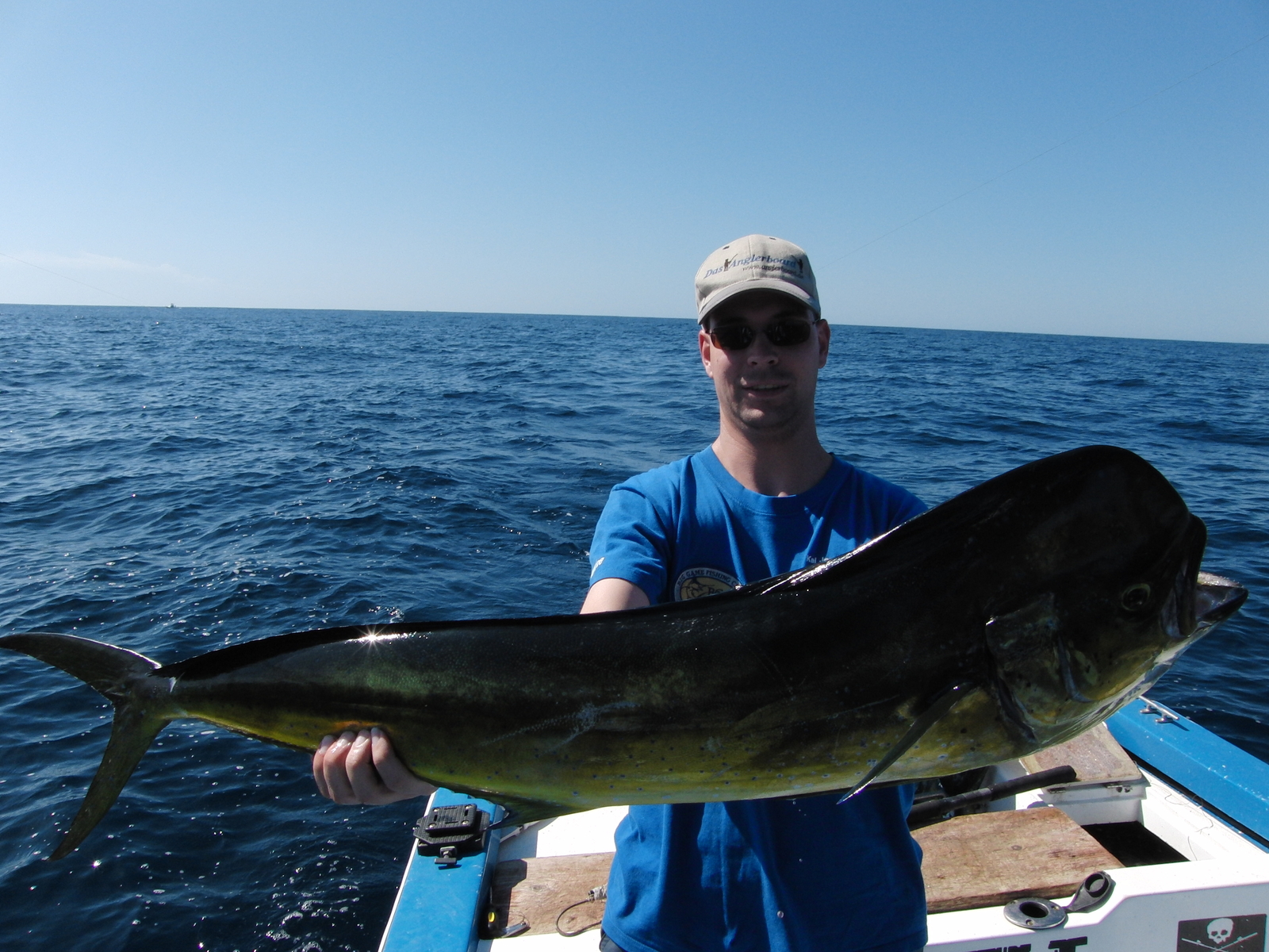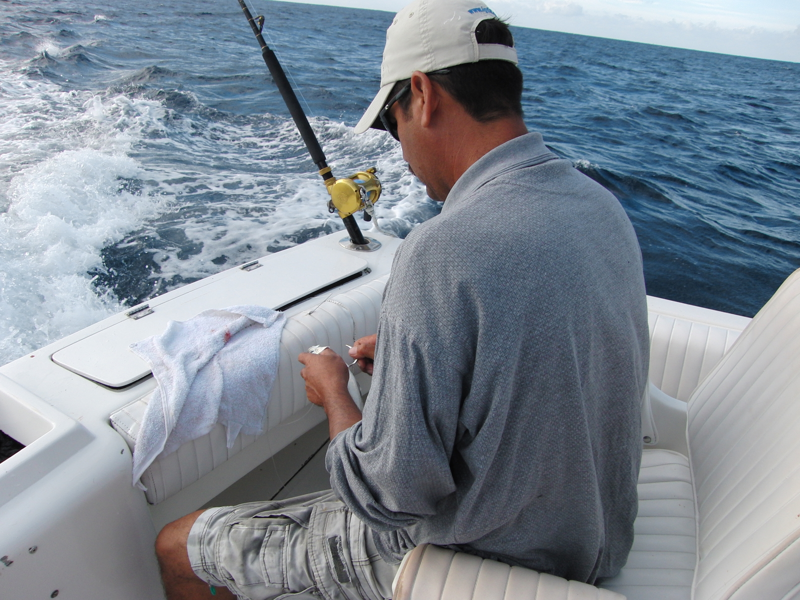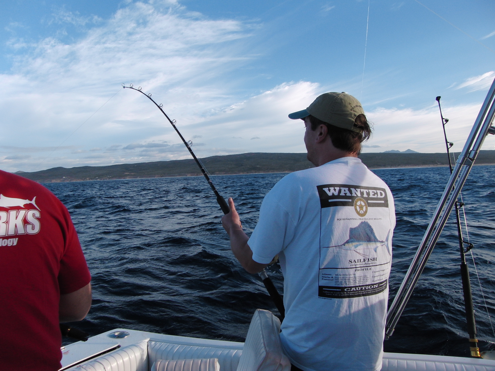 So, am nächsten Tag geht es mit der El Budster raus, mit Skipper Jose und Bootsmann Franzesko. Morgens wieder Köder geholt, und los kann es gehen. Geschleppt wird meist mit 3 Lure, 1 toten Köderfisch, und eine Rute wird mit einem lebendem Bereit gehalten, um einen gestreiften Marlin bei Sichtung anzuwerfen, oder bei einem Doradenbiß zu versuchen einen weitere zu Haken. Franzesko ködert sehr routiniert und schnell die Köderfische an. Wir fangen erst mal Doraden, aber dann kommt der Biß auf den toten Köderfisch, ein Marlin, Andreas kann ihn routiniert Ausdrillen und fangen.