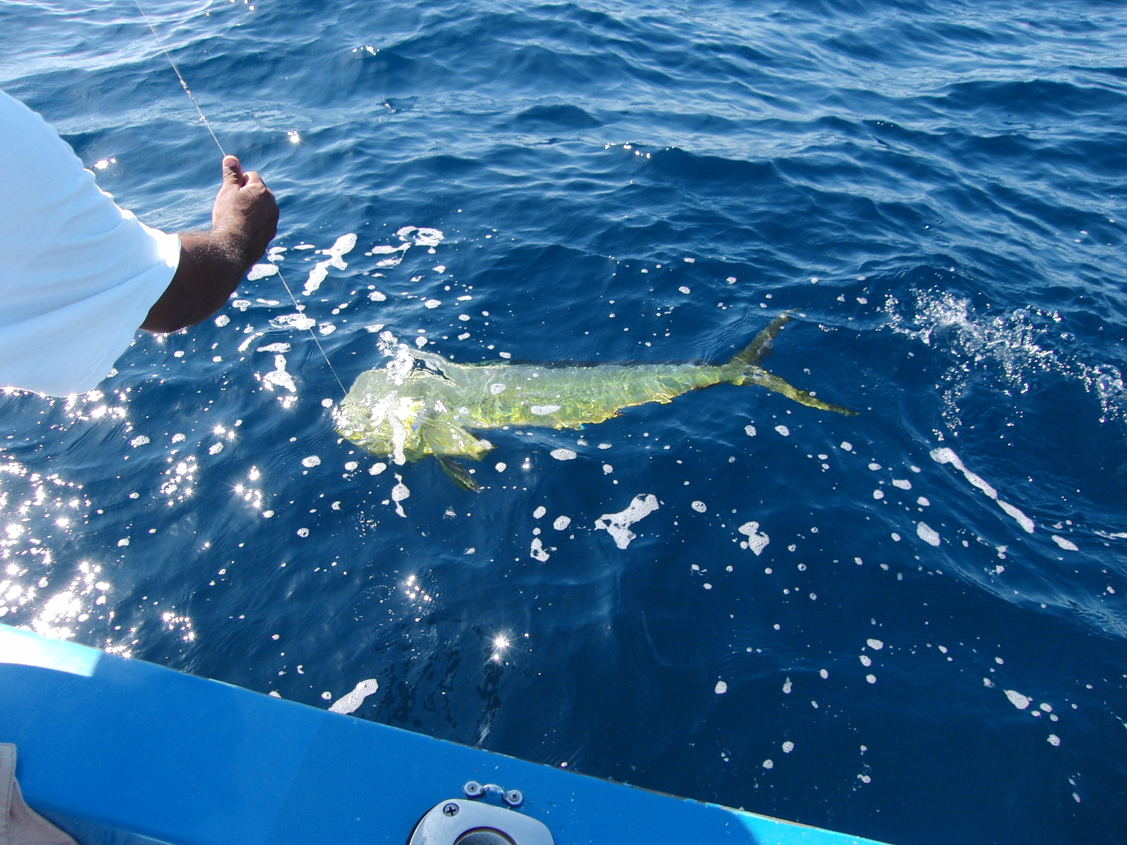 Der nächste Tag ist schnell erzählt, wir fangen einige Doraden, es ist unglaublich, da steigt eine ein, man wirft einen Köderfisch aus, und schwupp, hängt die nächste. Andreas hat jetzt auch eine leichte Popperrute mit auf das Boot genomme, um Doraden anzuwerfen. Ein Anblick für Götter, wenn man die Goldfarbenen Laiber im Wasser sieht. Da denke ich auch, das müsste jetzt Henrik erleben, bei unserem Malediventripp wollte es nicht klappen, und hier stehen sie gestapelt. Marline sehen wir, aber selbst ein Köderfisch vor dem Schwert läst keinen zum anbiß verlocken. Aber einfach genial, deren Brustflossen leuchten im Wasser wie blaue Neonröhren.