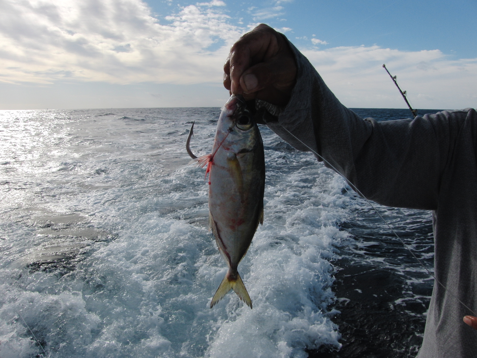 Direkt nach der Hafenausfahrt werden Köderfische gekauft, die Einheimische in kleinen Booten anbieten. Es wird erst einmal versucht mit Köderfisch etwas zu fangen, während ich einem größeren Spinner durchs Wasser ziehe, und so auch den ersten Fisch, eine Sierra Mackerel fangen kann. Über die Größe legen wir mal den Mantel des Schweigens. Andreas kann dann aber einen schönen Snapper fangen. Später versuchen wir mit Köderfisch langsam schleppend zu fischen, und können die ersten 5 Doraden fangen. Mittags geht es wieder zurück. -