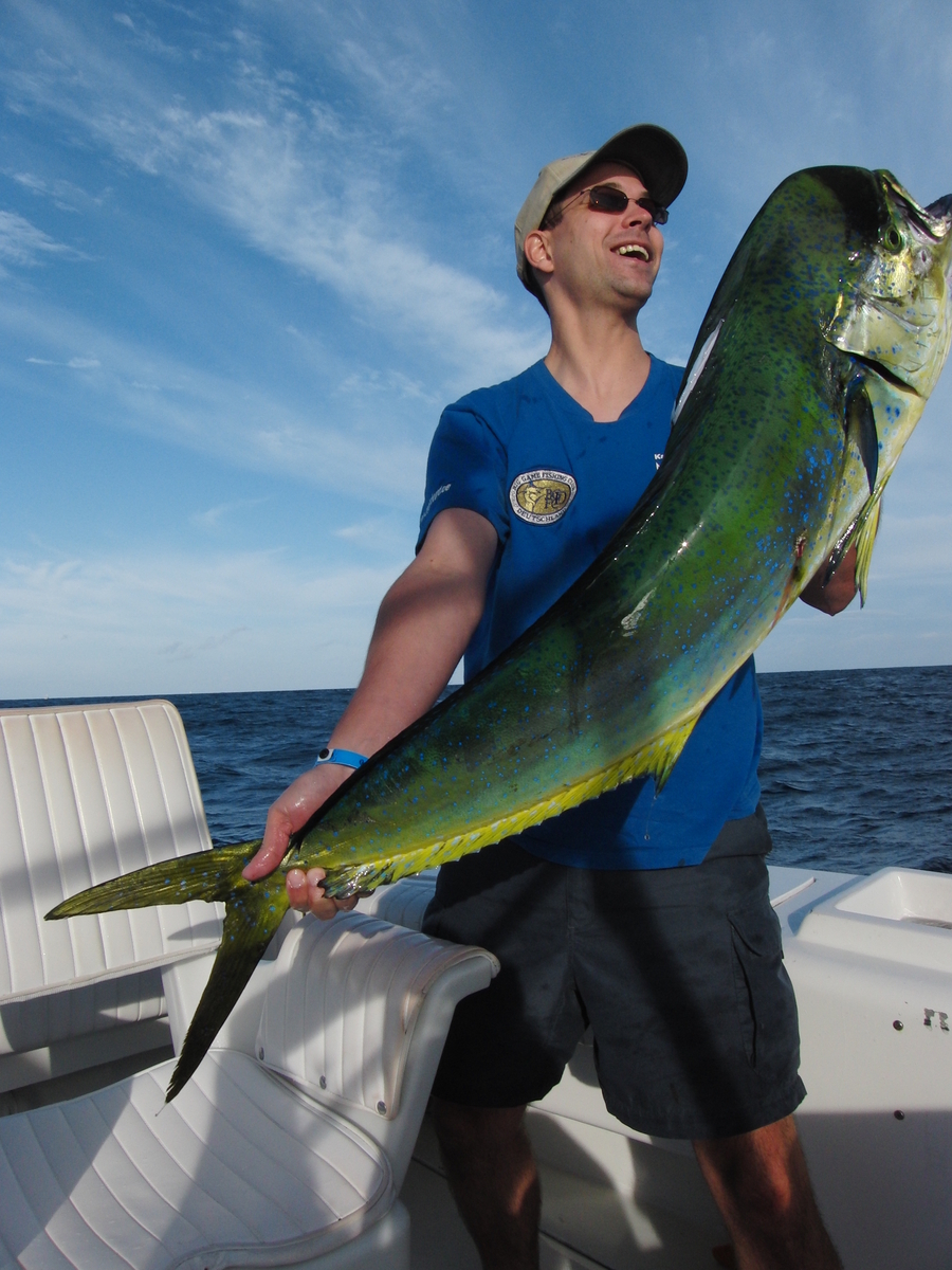 Der nächste Tag ist schnell erzählt, wir fangen einige Doraden, es ist unglaublich, da steigt eine ein, man wirft einen Köderfisch aus, und schwupp, hängt die nächste. Andreas hat jetzt auch eine leichte Popperrute mit auf das Boot genomme, um Doraden anzuwerfen. Ein Anblick für Götter, wenn man die Goldfarbenen Laiber im Wasser sieht. Da denke ich auch, das müsste jetzt Henrik erleben, bei unserem Malediventripp wollte es nicht klappen, und hier stehen sie gestapelt. Marline sehen wir, aber selbst ein Köderfisch vor dem Schwert läst keinen zum anbiß verlocken. Aber einfach genial, deren Brustflossen leuchten im Wasser wie blaue Neonröhren.
