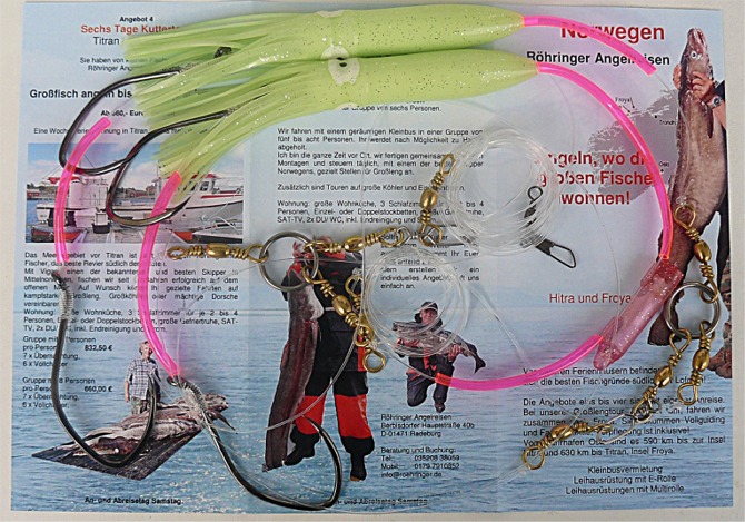 Die Großlengmontage Titran ist unsere erfolgreichste Montage und gehört zur Standartausrüstung bei unseren geführten Touren. Sie wird seit Jahren, selbst von unerfahrenen Anglern, erfolgreich für den Fang von richtig großen Fischen im Seegebiet vor Titran eingesetzt.