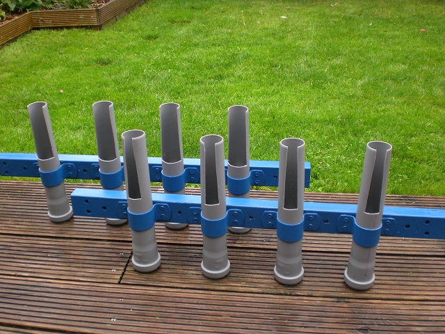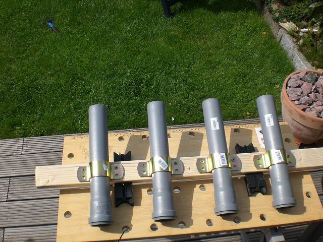 Preis für 8 Rutenhalter ( 2 mal 4 Stk ) ca 40.- €, das Teuerste sind die Messingschellen mit 3,25 pro Stück, Rohre 1,09 € pro Stück und zwei Stück gehobelte Dachlatte.