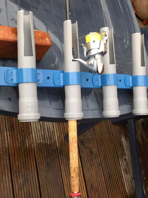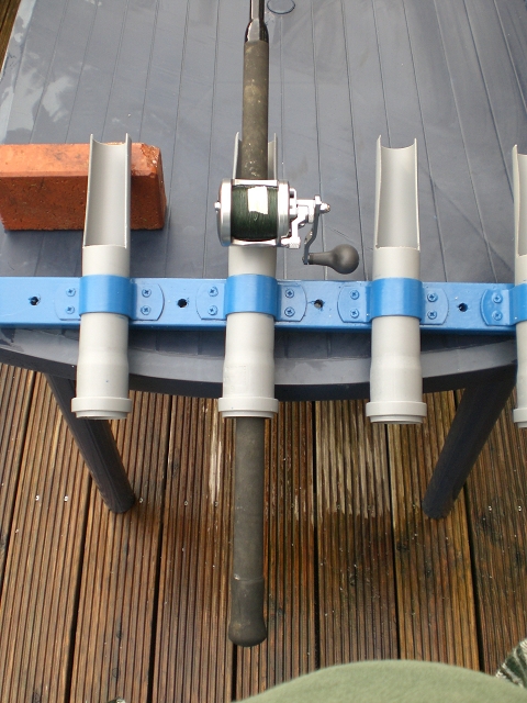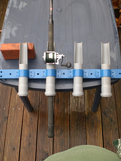 Ins Holz habe ich diverse Löcher gebohrt, damit man dort Plastikstrapse (weiß nicht wie die Dinger wirklich heißen:o) durchziehen kann.Man kann den Rutenhalter dann an einer Reling befestigen, ansonsten mit Schraubzwingen und kleinen Brettchen an die Bordwand klemmen oder wo sonst Platz im Boot ist.