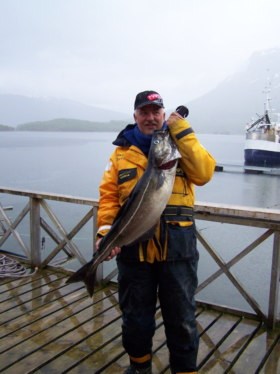 Mein Freund und Bootspartner Peter mit Dorsch und Traumhintergrund und 2 auf einen Streich