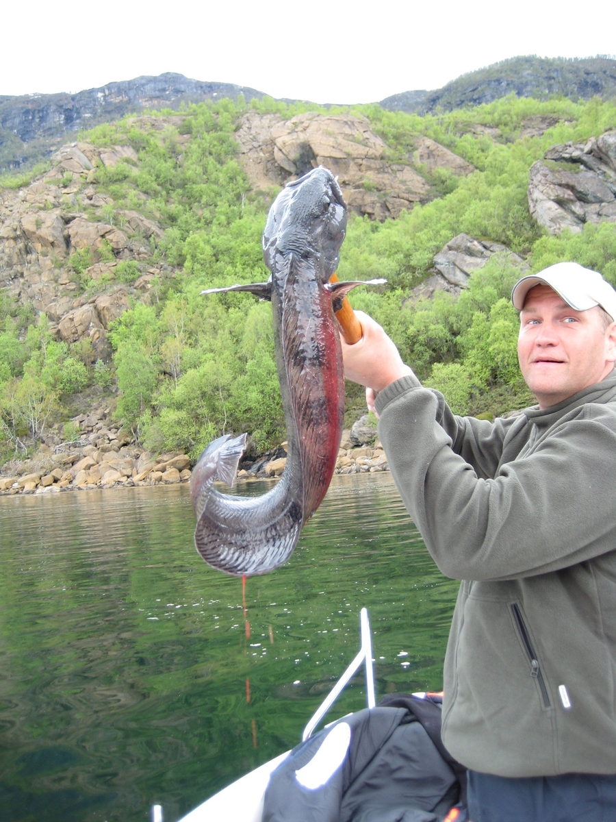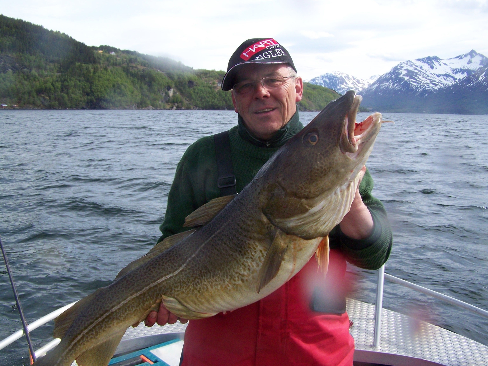 Mein Freund und Bootspartner Peter mit Dorsch und Traumhintergrund und 2 auf einen Streich