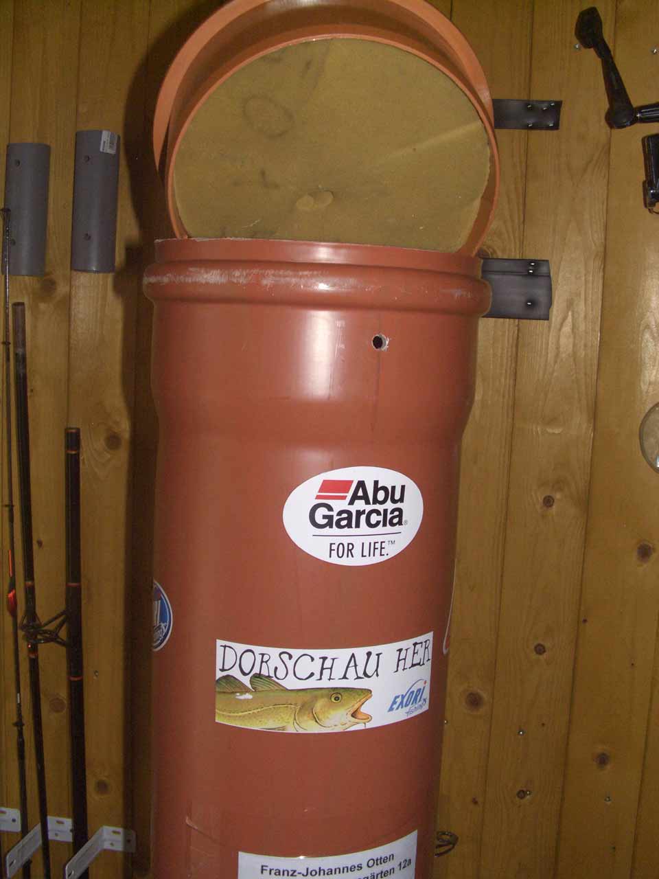 Ich habe ich dazu ein 250ger KG-Rohr genommen. Länge ca. 10 cm länger als das längste Rutenteil.