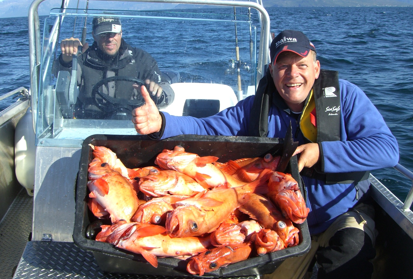 Wassertiefe zwischen 150 und 220 Metern...Überall dort anzutreffen, wo es ins tiefe Wasser (400m) übergeht...dort sind zur Zeit an vielen Ecken auch regelmäßig die riesen Köhler fangbar...die Rotbarsche stehen hier so um die 15-20 meter über Grund...Gewichte waren 350-400gr....
