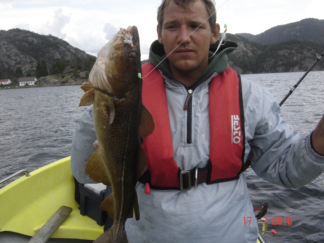 Um die Ecke, in den Stoldsfjord - Was machen die Makrelen??? Nach 2 - 3 Stunden hatten wir ca. 100 Stück im Maurertuben. Ein paar kleine Wittlinge, Dorsche, ein Schelli und ein Babyköhler wurde nebenbei erwischt und zurückgesetzt. Ca. eine halbe Stund haben wir es dann noch mal gezielt mit Makrelenfetzen auf Grund probiert - neben ein paar untermaßigen Dorschen kam noch ein 58-iger Tangdorsch ins Boot.