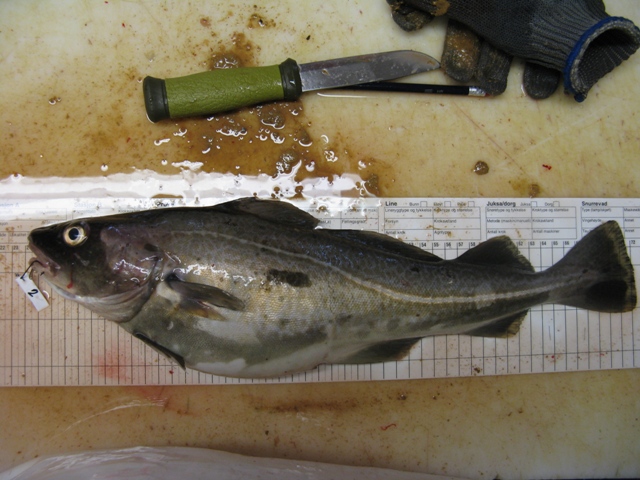 So konnte es weitergehen....nach einiger Wartezeit kam ein weiteres Boot mit dicken Fischen rein. Dieses Boot hatte an der gleichen Stelle geangelt wie das vorherige Boot. Nun war ich heiss und abends wollte ich unbedingt an der besagten Stelle einen Versuch starten. Doch bevor es losgehen konnte, sollte noch der Fang eines weiteren Bootes vermessen werden. Leider war der Fang eher weniger erfreulich. Insgesamt hatte das Boot 11 Dorsche um die 55 cm gefangen. Das Erschreckende: 10 von den Dorschen waren entflohende Aquakultur-Dorsche (siehe Foto). Auf meinem Trip im Juni hatte ich Æhnliches erlebt. Es handelt sich also keineswegs um einen Einzelfall. Der Eigentuemer der Angelanlage schætzt, dass allein in dieser Saison schon 2000 entflohende Kultur-Dorsche gefangen wurden. Was die Sache noch heikler macht, ist dass viele dieser Dorsche bis oben hin voll mit reifer Milch waren. Man kann nur hoffen, dass sie sich nicht fortpflanzen. Dies kønnte ansonsten schlimme Folgen fuer die Wildbestænde haben. Zøgert nicht mich zu kontaktieren, falls ihr æhnliche Fænge in eurem Gebiet erlebt. Die Kulturdorsche kann man leicht an dem kleineren Mund, der helleren Farbe und des dicken Bauches erkennen. Oft sind einige der Flossen auch verkrueppelt.
