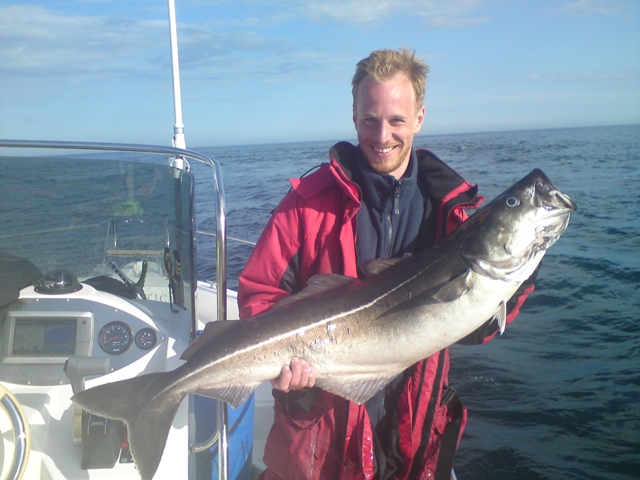 Nach diesem tollen Angeltrip nahm ich am Donnerstag die Fæhre von Bodø nach Værøy. Das Wetter was einfach grandios und ich machte es mir auf einer Liege auf dem Aussendeck gemuetlich. Die Erwartungen fuer Værøy waren hoch, da hier regelmæssig kapitale Dorsche gelandet werden. AmFreitag waren alle Boote draussen und ich konnte viele Fische bis 10 kg messen. Ihr kønnt euch vorstellen, dass ich natuerlich umso heisser aufs Angeln am næchsten Tag war. Johan Abelsson von Wildwater Fishing lud mich zu einer gemeinsamen Angeltour zusammen mit ihm und Bjørn Blomquist ein. Morgens um 10 Uhr ging es los. Zunæchst schleppten wir mit Hering auf Heilbutt, aber da das Wasser auf dem Tiefststand war, entschlossen wir uns, es lieber auf Grossdorsch und Køhler zu probieren. Leide fehlte bis zum Nachmittag die Strømung, sodass wir nur wenig Drift hatten und "nur" eingige Dorsche bis 5 kg fingen. Doch dann, mit dem Einsetzten der Stømung, sollte es losgehen. Zuerst stieg bei Bjørn ein super Køhler ein, und der Fisch riss ohne zu stoppen Schnur von der Rolle. Ich liess meinen Gummifisch wieder Richtung Grund sausen. Doch dort kam er nicht an, denn auch bei mir stieg ein toller Fisch ein. So standen wir beide mit gekruemmter Rute im Boot und drillten unsere Fische. Nach einem gigantischen Doppeldrill durchstossen zwei tolle Grosskøhler die Oberflæche. Das Massband zeigte fuer meinen Fisch 106 cm und die Waage 12,6 kg. ![]()
