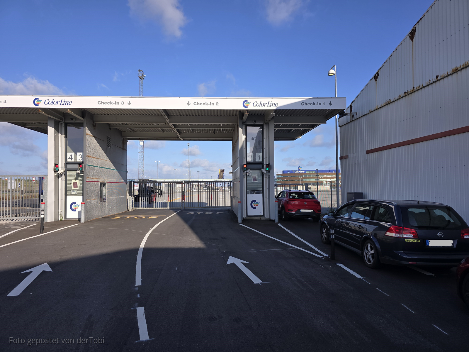 Gegen 8:15 Uhr waren wir die zweiten an der Colorline Schranke und standen in der Poleposition auf dem Warteplatz am Fähranleger.