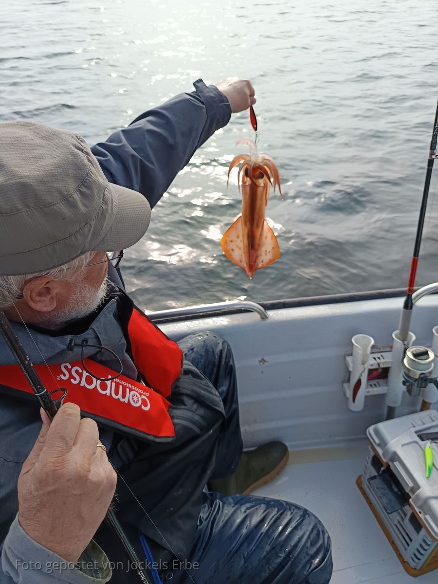 Trotzdem war die Fischkiste ganz gut gefüllt. Sogar einen Kalmar konnten wir ins Boot holen. Hatten wir bis da noch nicht gefangen.
