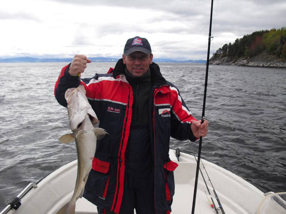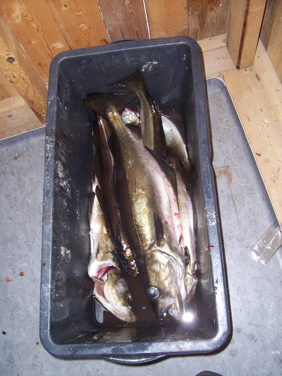 Nun kam die Sonne langsam höher und die ersten Jacken flogen durch das Boot.Ihr folgten dann noch die Hosen.Da wir null Wind hatten war die gefühlte Temperatur 25 Grad.Wasser nun schon 12,5 Grad.Nun zum Dorsch.Erster Stopp bei 25 Meter und nichts.15 Meter,noch weniger.Also dann wieder auf 7-10 Meter.Fast jeder Wurf ein Dorsch,untermaßige waren sehr selten.Kurz mal die Funke an und Tino`s Boot kontaktiert.Keine nennenswerten Fänge,waren unsere beiden "Spezis"doch wieder auf Großfisch aus.Unsere Kisten waren schon gut gefüllt und immer wieder zwischendurch wurden die Fische versorgt(ausgenommen),sollte ja auch nicht gar werden in der eigenen Brühe.Einer in unseren Boot versuchte ständig mit kleinen Pilkern auf Pollack und Köhler zu angeln.Die Drifft sorgte dafür das wir langsam ins tiefere Wasser kamem.So bei 20 Metern knallte der erste bessere Köhler an die Angel.Also alle schnell die zweite Angel und los gings.In kurzer Zeit waren 8 schöne Köhler zwischen 60 und 70 cm im Boot,und immer wieder zwischendurch der eine oder andere Pollack(bis 80 cm).Der Spuk war von einer zur anderen Sekunde vorbei.Die großen Schwärme waren eh noch nicht im Fjord.Unser soll war mehr als erfüllt und nach dem Fang kommt wie immer die Arbeit.Abruch wenn es am schönsten ist,und auserdem haben wir Urlaub.Ausgetrocknet von der Sonne dann erst mal ein bis drei Bierchen.Die Verarbeitung ging rasch und schnell lagen die nächsten 15 Kilo Fillet in der Truhe.Nach 3 tagen der Fazit,jetzt locker angehen und mal andere Arten fangen.