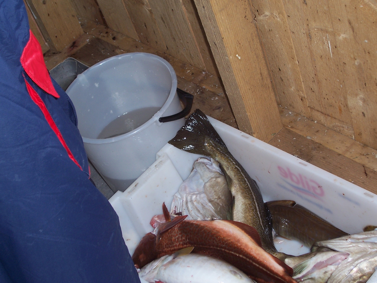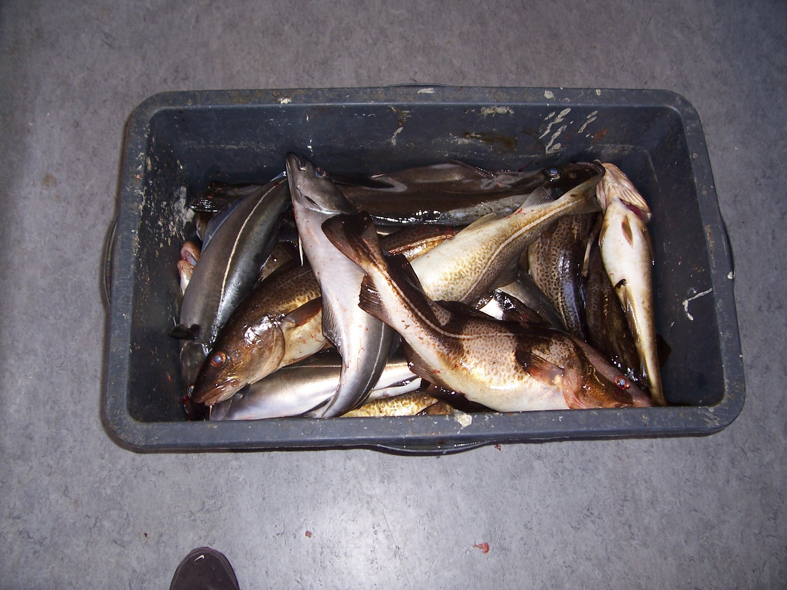 Boot 2 ist eingetroffen.Lange Gesichter und nicht zu volle Kisten.Ein Küchenleng und paar schöne Dorsche.Die Heilbutt hatten doch noch ne Schonfrist.Schnell alle zusammen den Fisch verarbeitet und alles war in Sack und Tüten.