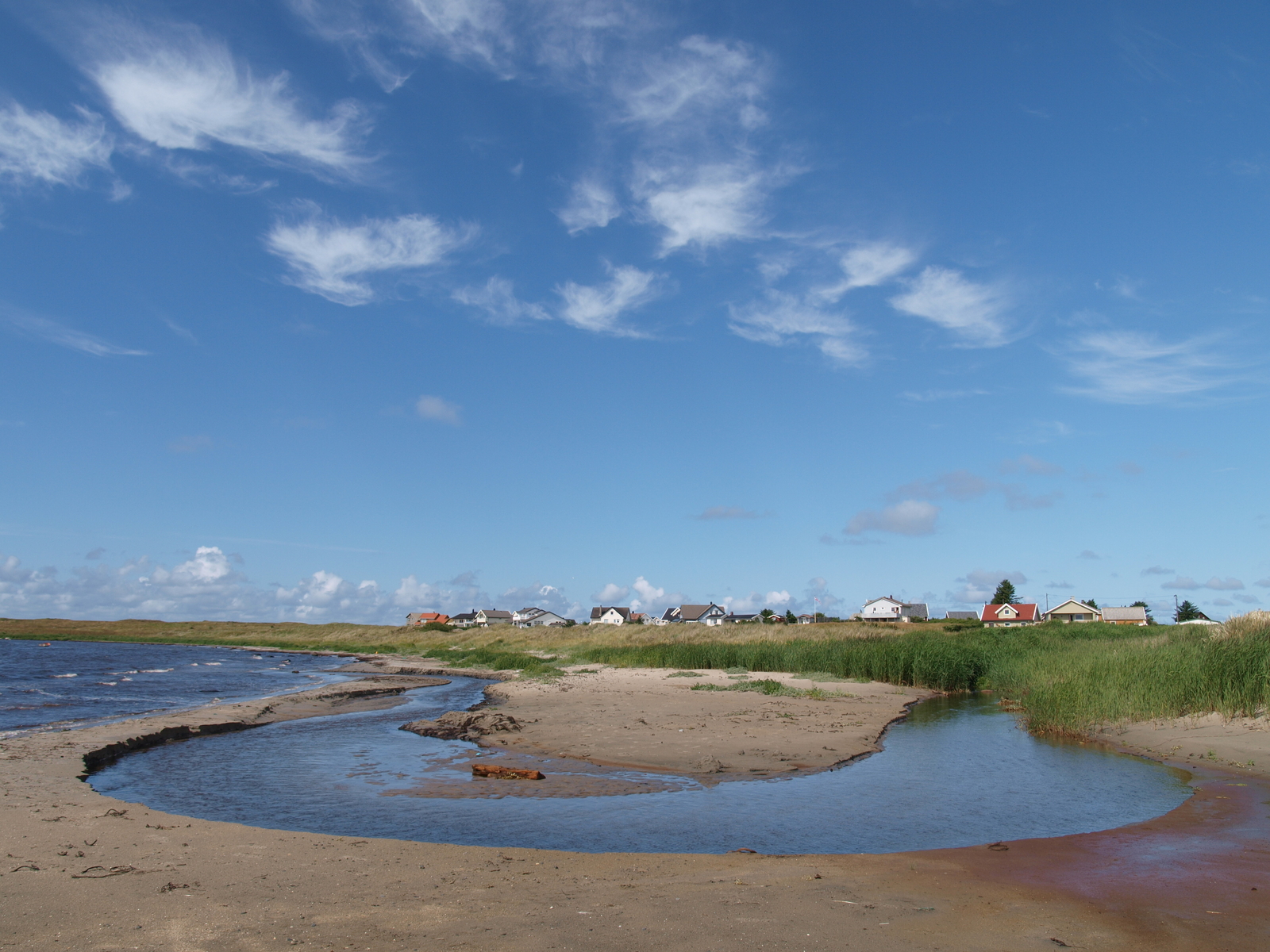 Ein kleiner Bach mündet hier in die Nordsee und verformt die Ausflussstelle ständig. Ein weiterer kleiner Bach wird durch eine riesige Röhre unter der Küstenstraße hindurch geleitet. Schmalblättriges Weidenröschen blüht auf den angrenzenden Wiesen, der schmale Dünenstreifen ist durchwachsen mit Strandgräsern, in den Dünen liegen noch zwei alte, schon fast zugewehte und zugewachsene MG-Bunker der dort während des Krieges stationierten deutschen Küstenbewachung.