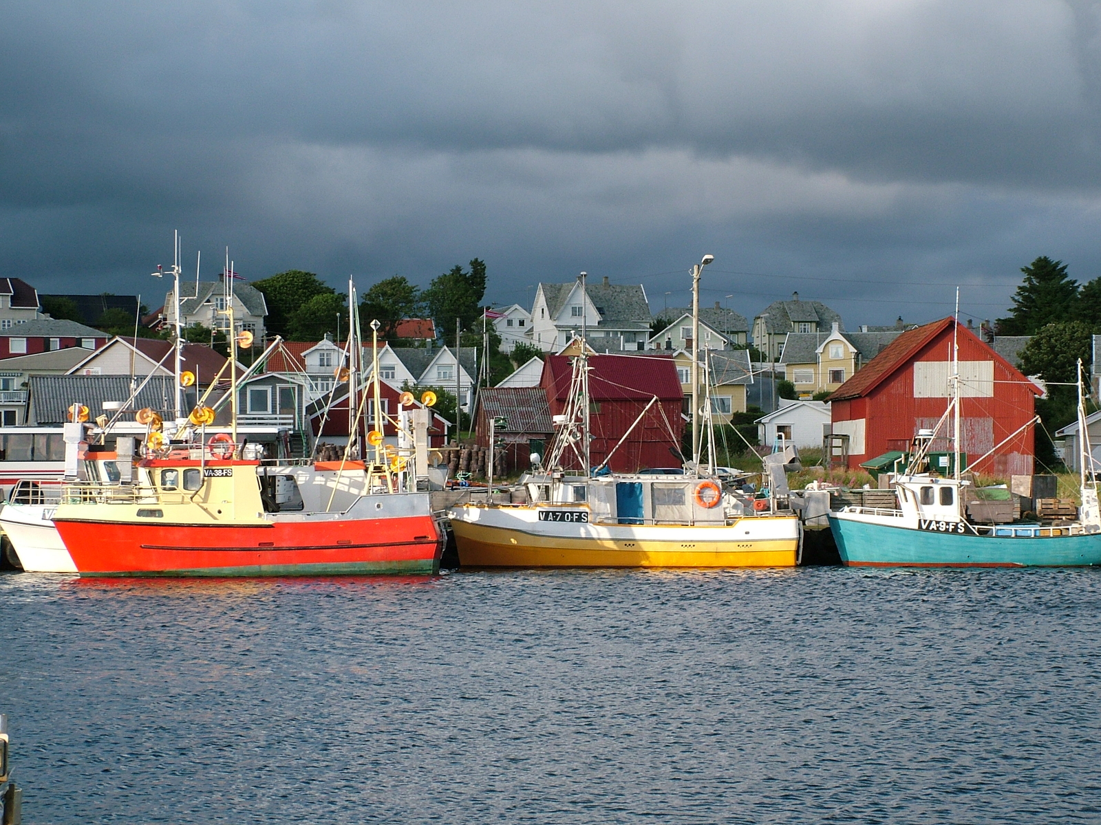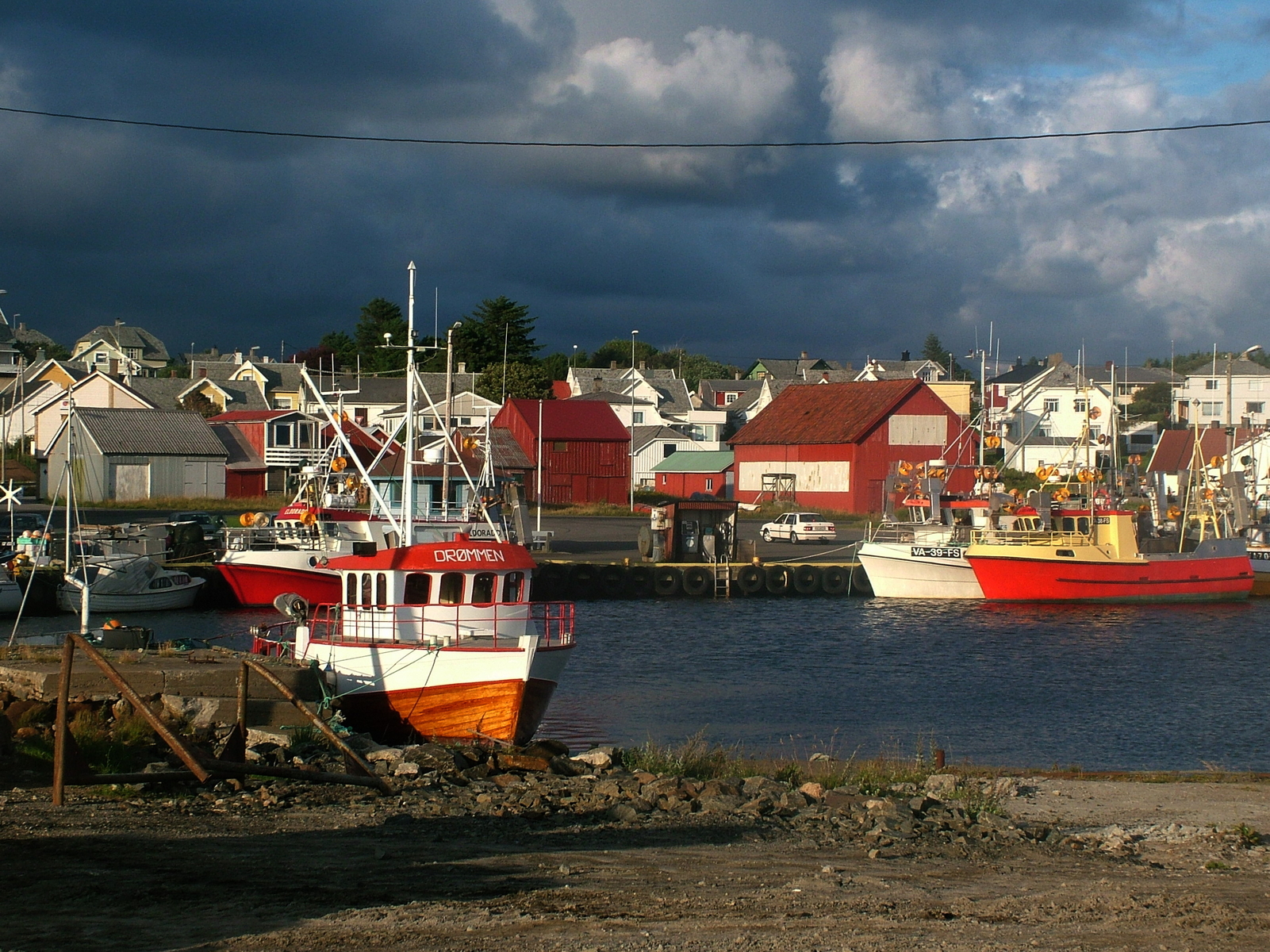 Viele verschiedene Schiffstypen sind im und außerhalb des Hafens vor Borhaug zu beobachten. Vom großen Färhschiff, über kleinere un d gelengentlich große Luxusboote und vielen Variationen der Dieselschnecken bis zum kleinen Ruderboot mit Außenborder ist alles vertreten.