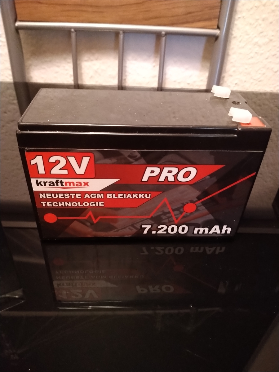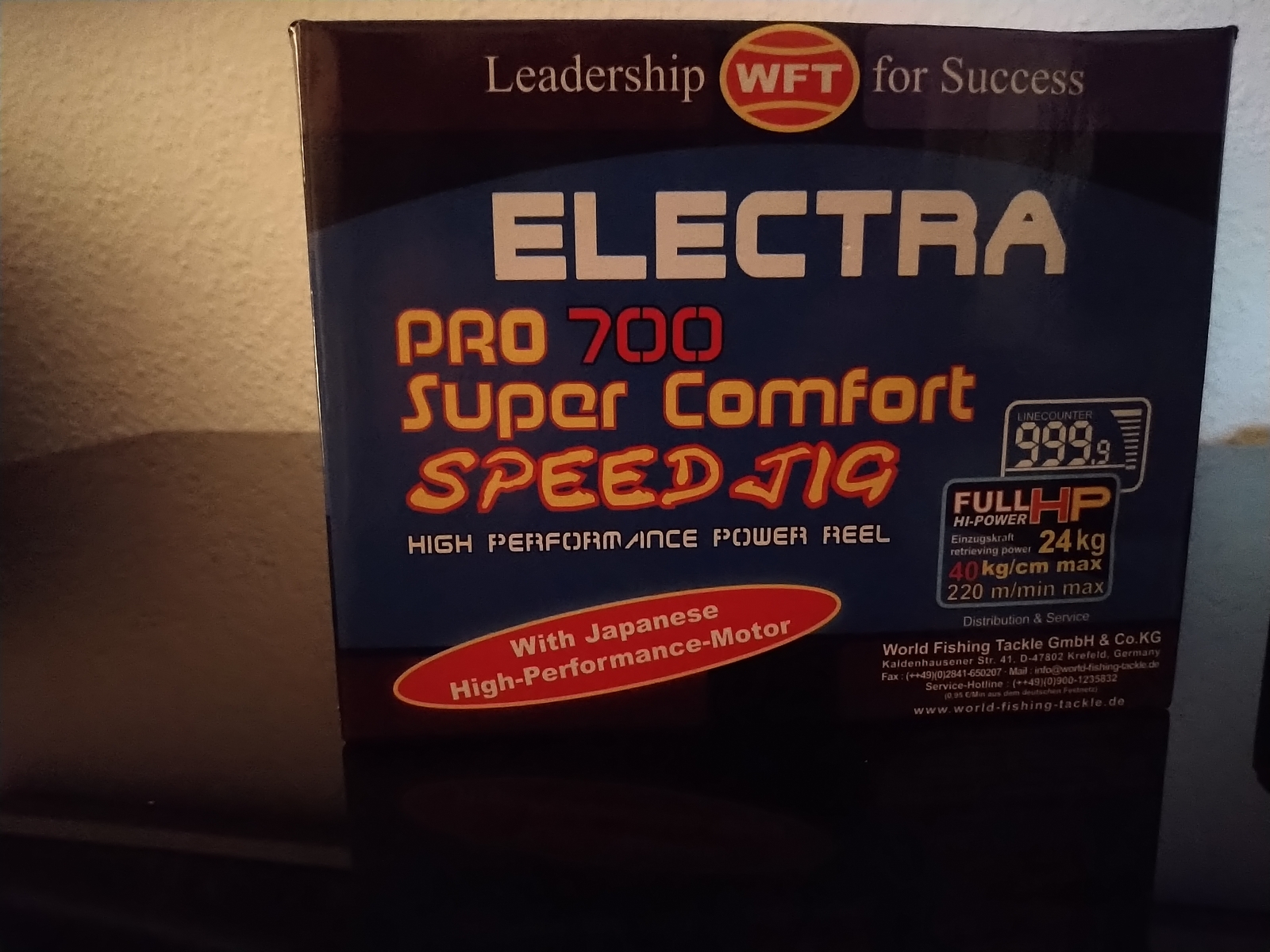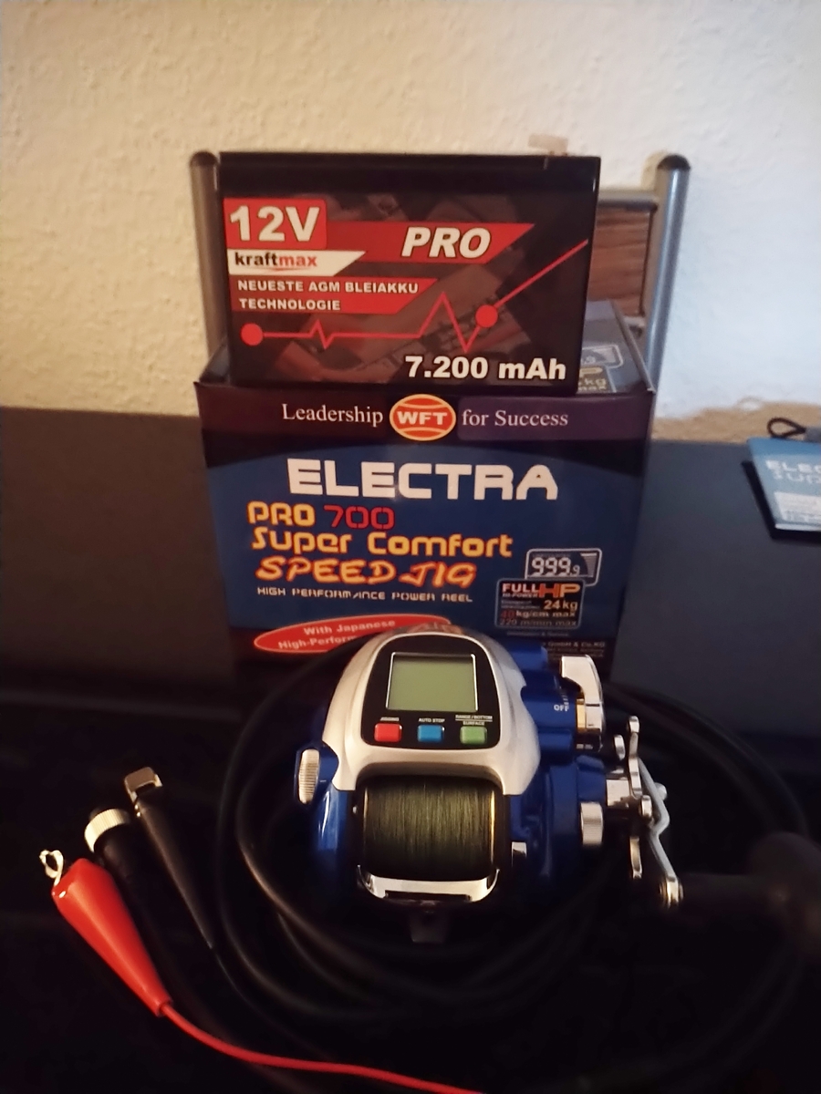Auf der Spule befinden sich 480m geflochtene WFT KG 39 Kg. Dabei sind das Akku-Kabel, 1 Beutel für die Rolle und Bedienungsanleitung. Dazu gibt es einen Akku 12 Volt Kraftmax