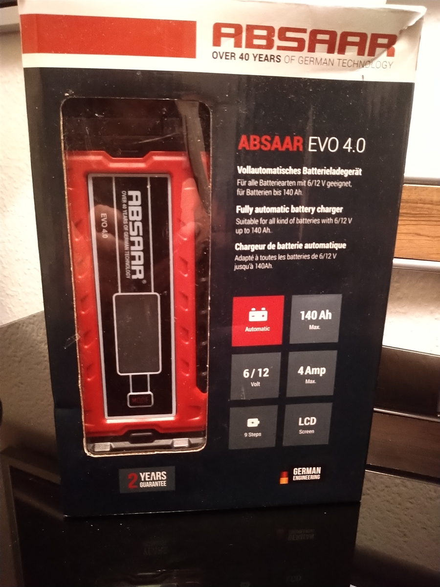 und ein Ladegerät Absaar EVO 4.0. Beide sind neu und unbenutzt.