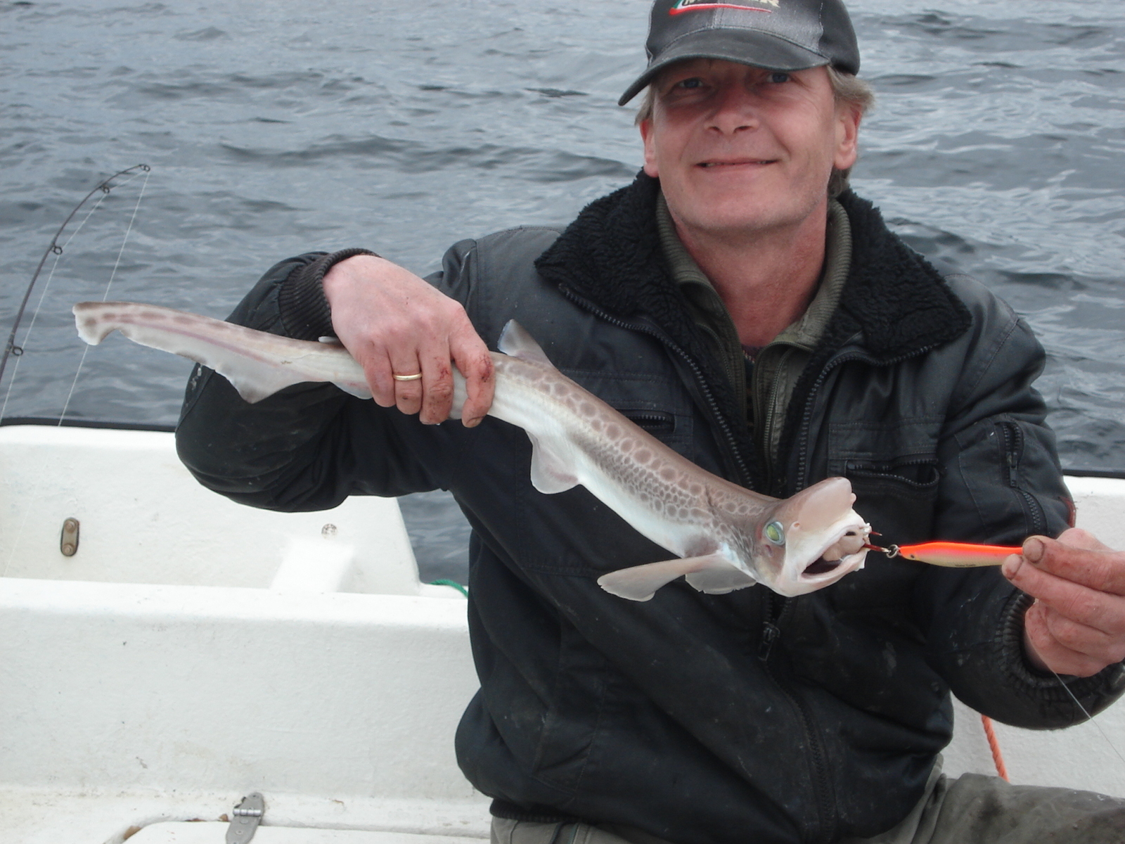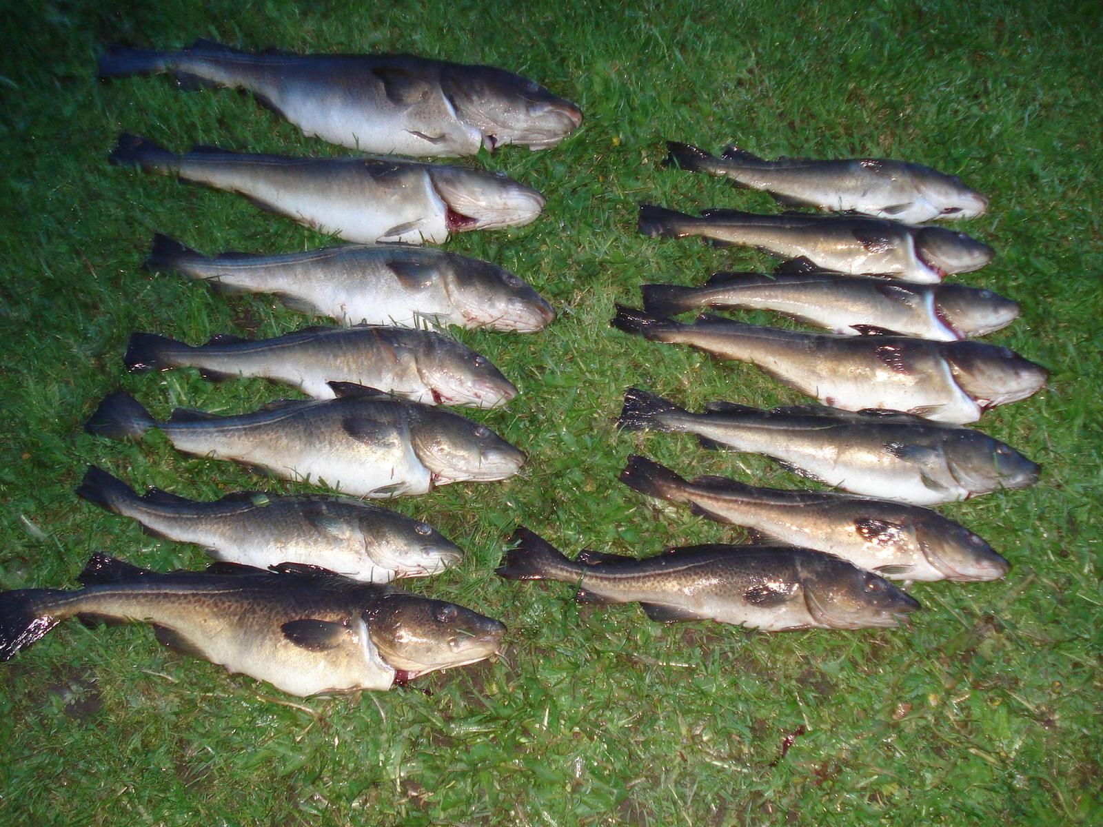 Wir konnten in diesem Urlaub über 13 Fischarten fangen. Gerne zähle ich sie auf: Dorsch, Köhler, Pollack, Leng und Lumb (klein), Scholle, Flunder, Makrele, Knurrhahn, Katzenhai (glaube ich), Schellfisch, Rotbarsch und Seehecht.