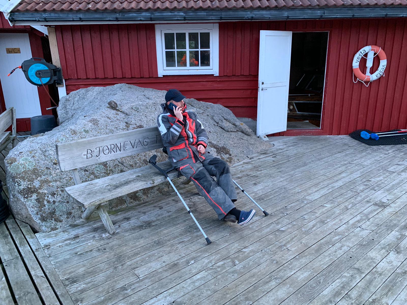 die Boote wurden übergeben und es sah alles danach aus als wenn dem unbeschwerten Angelurlaub nichts mehr im Weg stand ,leider hat sich einer unserer Mitreisenden unglücklich auf dem Steg bewegt und sich dabei das Knie verdreht , es wurde erst gedacht das wird gleich wieder und es wurde zum Angeln abgelegt . Diese Tour ging aber ziemlich bald zuende weil die Schmerzen schlimmer wurden und das Knie immer weiter anschwoll, also Abbruch und zurück zum Hafen, von da aus ging es dann nach Kristiansand ins KH. Ergebnis Bänder gerissen aber O-Ton vom Arzt ,da kann man erstmal nix machen und ob sie nun hier liegen oder auf dem Sofa wäre egal ,man könnte aber auch Angeln gehen ,also gings mit ner Schiene, Schmerzmedis und Krücken zurück zum Haus.