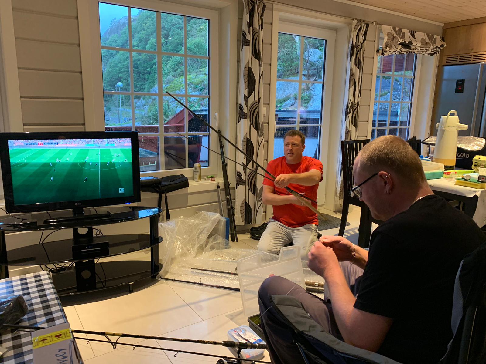 Also wurden die Wohnzimmer erstmal in Angelzubehörgeschäfte umgewandelt und Ruten vormontiert damit es morgens gleich losgehen konnte.Auch die gemütlichen Angelpuschen wurden angezogen