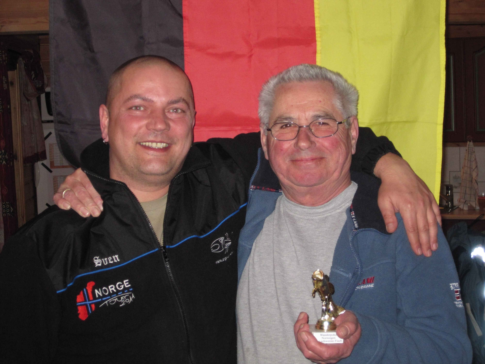 Zum Thema Wanderpokale - Vergabe vor der Fahne: Das Remis ist geblieben, zwei Tiere a´104 cm, Gottlieb sein Dorsch wog 12,8 kg - deshalb gibt´s den Pokal für den Schwersten Fisch.