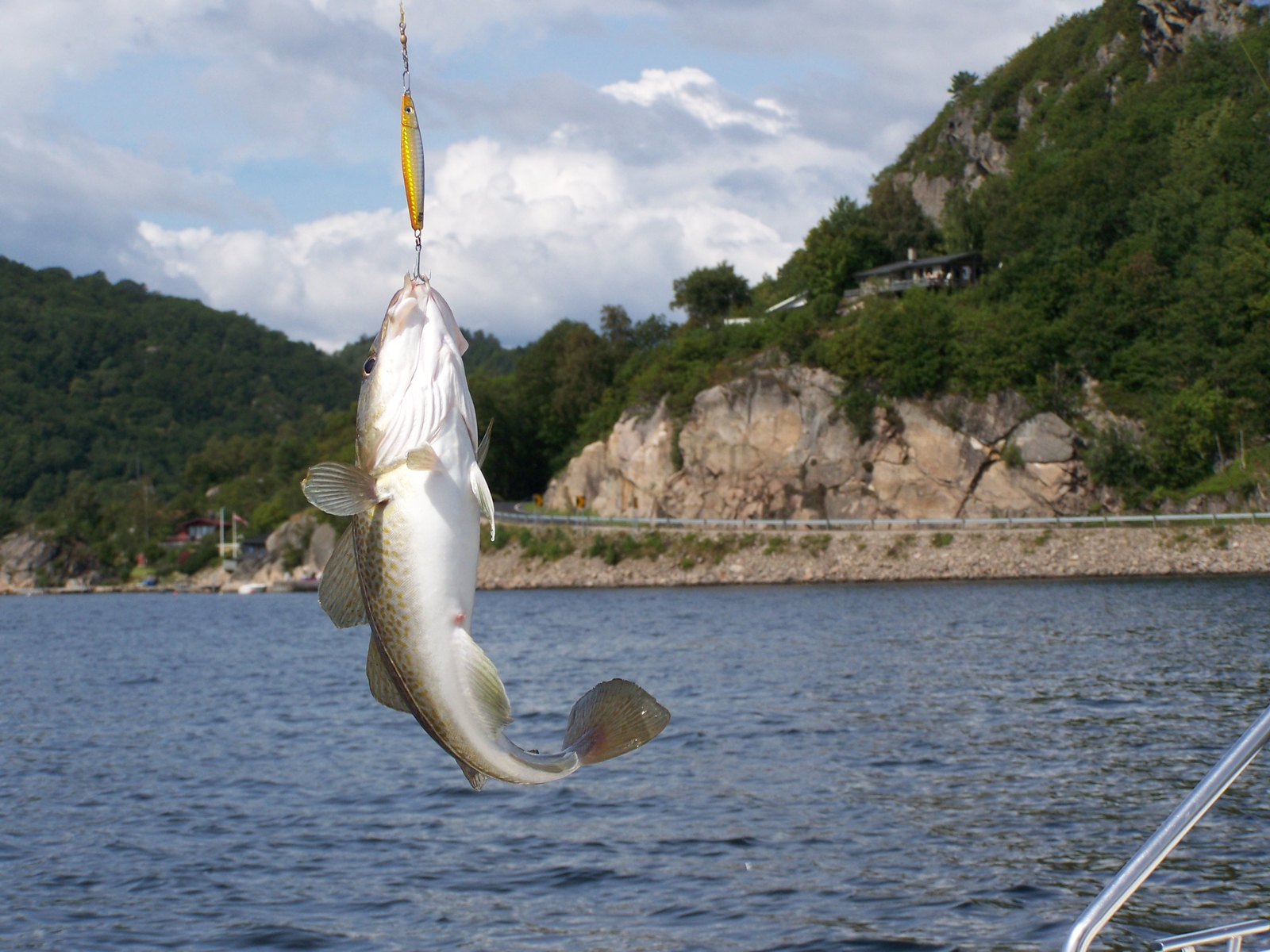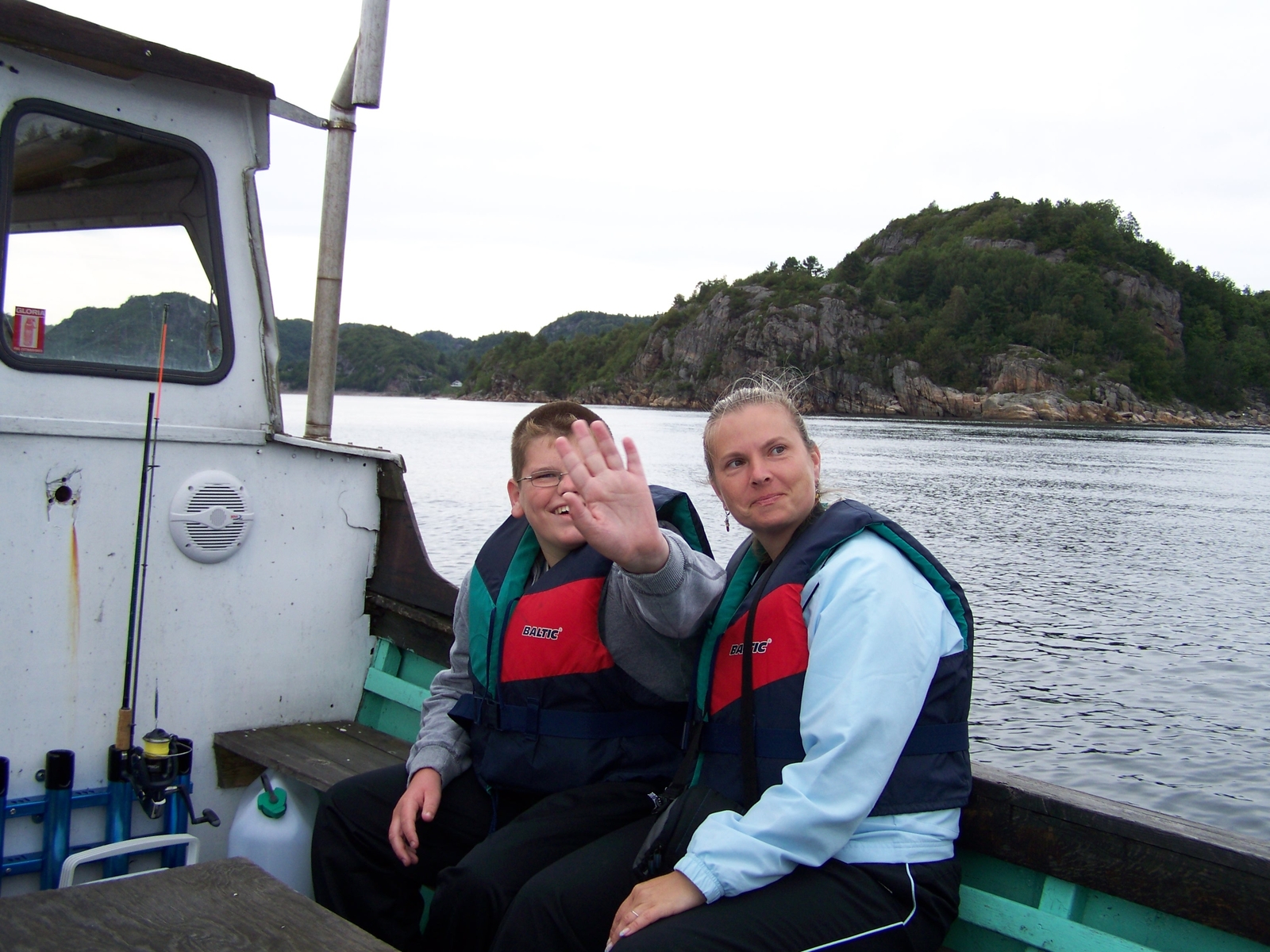 Am Anfang war es gar nicht so einfach dieses Boot zu steuern, auch war es ja für mich das erste Mal selbst am Steuer zu stehen. So war ich froh das mir im Kanal keine größeren Boote entgegen kamen. Nach erfolglosen Angeln im Lenefjord und Grönsfjord beschlossen wir, es in Ufernähe auf dem Meer zu versuchen. Recht schnell hatten wir zwei schöne Makrelen. Dann wollte ich einmal probieren, wie lange eigentlich der leichte Blinker braucht um bei einer Wassertiefe von ca. 40 Meter den Grund zu erreichen. Die Schnur wurde schlaff, ich legte den Bügel der Rolle um, hob die Angel an und hatte sofort einen ungewohnten Wiederstand. Das konnte keine Makrele sein. Nach kurzem Drill konnte ich dann einen schönen Dorsch landen.Allerdings hatte dieser Fang dann ein Nachspiel. Ich weis nicht wie es passierte, ich merkte nur einen kurzen Stich, dann hatte ich den Drilling selber direkt an einem Gelenk im Finger. So haben wir dann den Angelausflug abgebrochen und sind nach vielen Fragen und Suchen nach Mandal zum Arzt. Unsere Urlaubskasse sah ich schon schwinden, aber ich war mit 330,-NKR auch den Drilling wieder los. Den nächsten und letzten Urlaubstag haben wir dann bis zum Mittag auf dem Meer verbracht. Der Vermieter vom Hüttenservice (ein Ex-Berliner) hatte uns die Schlüssel vom Boot belassen, damit wir den Tag auch voll machen konnten. Bei leichtem Regen haben wir aber nur noch eine Makrele und einen Lippfisch landen können. Irgendwie waren wir dann aber auch schon gedanklich bei der Abreise, daher haben wir den restlichen Tag im Ferienhaus verbracht. Unser Erstaunen war groß, als am späten Nachmittag ein Militär oder Polizeiboot an unserem Haus vorbeifuhr. Abends erfuhren wir dann im Fernsehen von den Anschlägen in Oslo und Umgebung.