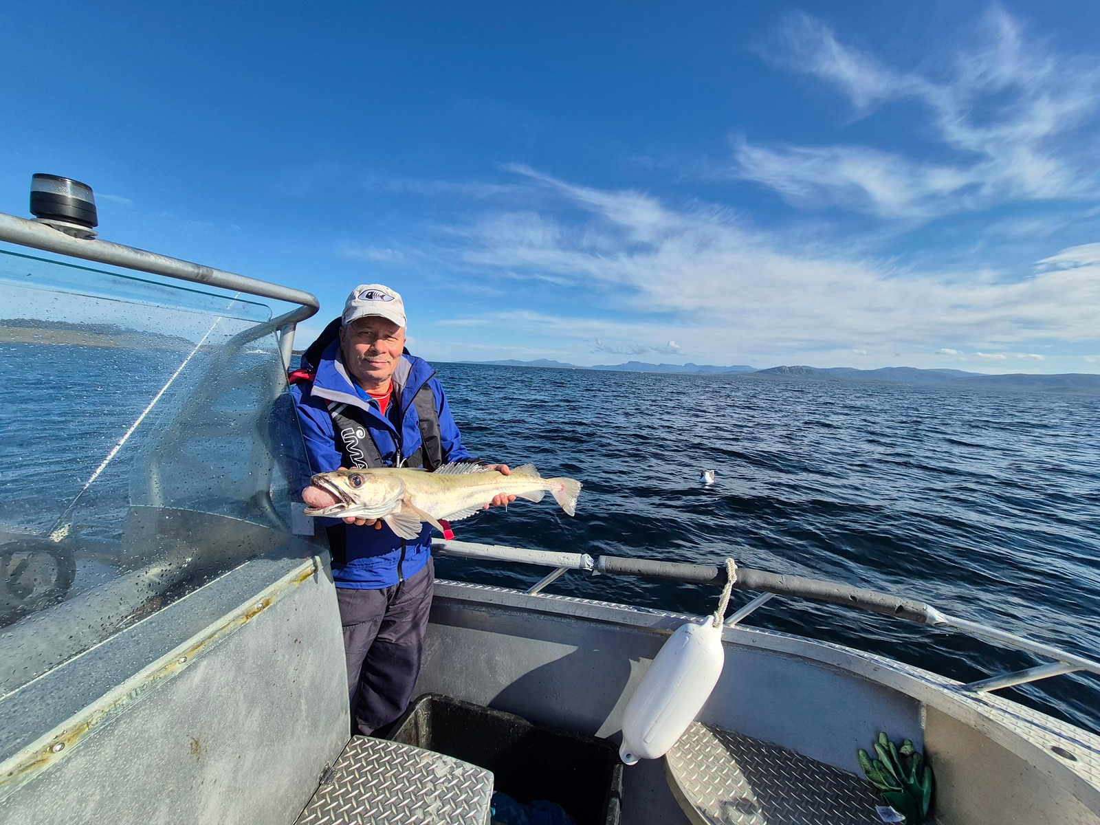 Eine Stunde und ein bischen später, wir sind mal wieder bei der Seehechtangelei, hat Rolf einen echt harten Einsteiger mit einem Anschlag quittiert....KNACK! Er hat seine Rute zur Reiserute gekürzt und dadurch natürlich auch seine Schnur nebst Naturködermontage verloren.